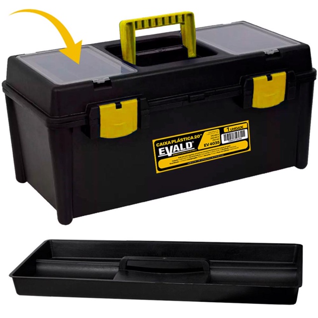 Caixa de Ferramentas 20 POL com Bandeja e Tampa com 2 Divisórias EV4035 EVALD Caixa De Ferramenta para Uso Profissional com bandeja interna removivel e divisor na tampa Caixa organizadora de plástico premium tamanho grande feita com material extremamente resistente! Possui 1 bandeja removível e a tampa tem 2 divisórias, é super leve e tem ótimo espaço de aproveitamento. DADOS TÉCNICOS: Modelo: EV4035 Comprimento: 51,0cm Altura: 23,3cm Largura: 24cm Cor: Preta Composição: Polipropileno + Pigmentos Utilidade: Uso diversos Validade: Indeterminado Peso: 1,8 KG Marca: Evald Garantia: 3 meses * Imagens meramente ilustrativas.
