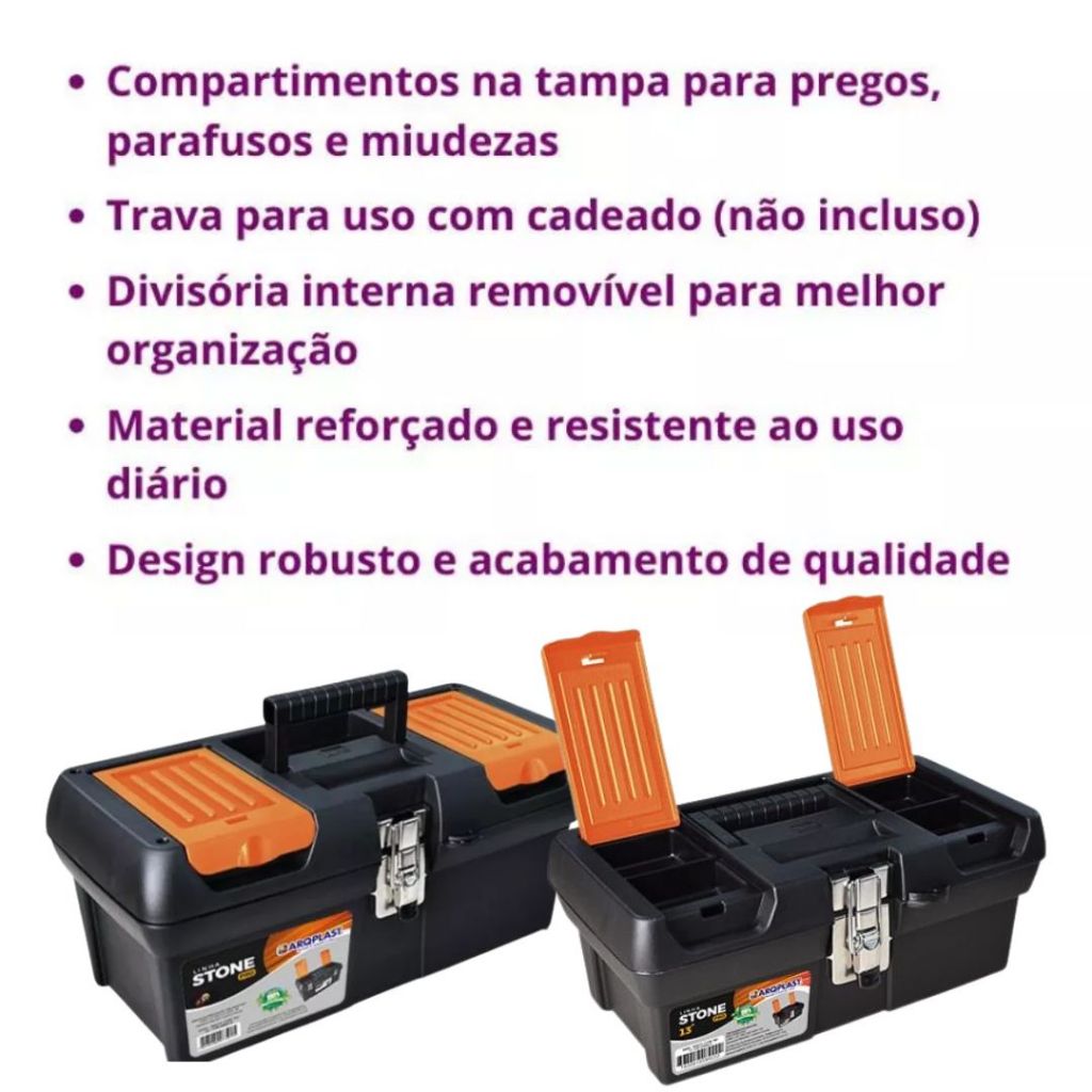📦 Maleta/ Caixa de Ferramentas Stone Pro 13” com Trava para Cadeado | Organização reforçada no tamanho compacto ⚠️ Atenção! Aviso ao Cliente ⚠️ Antes de comprar, verifique atentamente as fotos e a descrição do produto deste anúncio. ❗ Os vídeos de afiliados são apenas ilustrativos e podem não corresponder exatamente ao produto anunciado. ❗ Modelo resistente com acabamento de excelente qualidade. O fecho metálico garante durabilidade e segurança, enquanto os dois compartimentos na tampa mantêm pregos, parafusos e miudezas sempre à mão. Por dentro, a bandeja divisória ajuda a organizar as ferramentas. Para completar, a maleta possui trava para uso de cadeado, protegendo seu equipamento no transporte e no dia a dia. ✅ Informações do Produto: Modelo: Stone Pro 13” com trava para cadeado Material: Corpo em Polipropileno (PP) reforçado; fecho em metal Medidas: 32,5 × 19,5 × 13,5 cm Cor: Preto com Laranja Origem: Brasil Garantia: 7 dias contra defeito de fabricação (conferir no ato do recebimento) 📦 Conteúdo da Embalagem: 1 maleta Stone Pro 13” 1 bandeja/ divisória interna ✅ Benefícios: Trava para cadeado: mais segurança para suas ferramentas Fecho metálico: resistência e longa vida útil Compartimentos na tampa: acesso rápido a pequenos itens Bandeja interna: organização inteligente do espaço Compacta e robusta: ideal para uso doméstico, profissional ou hobbies 💡 Dica de uso: Use um cadeado pequeno (haste fina) na trava. Distribua o peso entre a bandeja e o fundo para evitar esforço no fecho. Limpeza com pano úmido e sem solventes. ✨ Garanta a sua agora – Loja Almeida Variedades 📌 Atendimento rápido e suporte pelo chat para qualquer dúvida.
