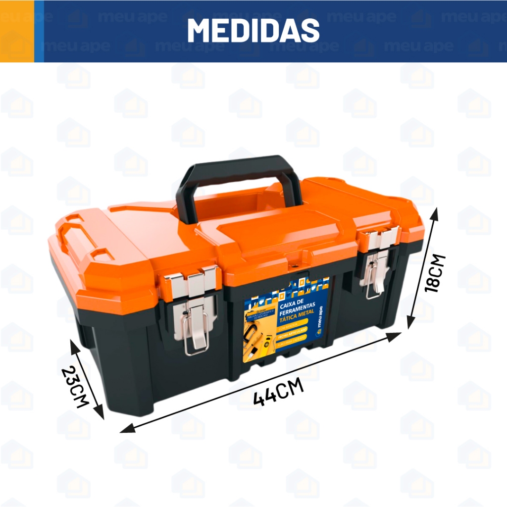 🧰 CAIXA DE FERRAMENTAS 18.3" PP/METAL Agora vai ficar muito mais facíl de guardar e/ou transportar suas ferramentas, adquira sua mais nova Caixa de Ferramentas Grande, Reforçada e muuuuito barata, o melhor custo/benefício existente hoje no mercado, irá trazer robustez, espaço, ergonômia e ótimo acabamento em um só produto! Possui um grande diferencial que é seus fechos metálicos, trazendo muuuito mais reforça para a Caixa de Ferramentas. Esta é especial para você que presta serviços de manutenção de qualquer espécie, mecanico, marceneiro, pedreiro e precisa das ferramentas sempre ao seu lado, a Caixa de Ferramentas Tática é perfeita para você! Sem contar que possui um design muito moderno e bem acabado, feitas com um fecho articulado metálico robusto e testada para que a maleta não se abra e caia tudo pelo chão :D. A Caixa de Ferramentas Grande Tática é de 18.3 polegadas (44cm de comprimento X 23cm de largura e 18cm de altura) é feita em Polipropileno de qualidade, possui alça para transporte, fecho robusto possuindo também uma bandeija onde faz a separação dos dois compartimentos internos da Caixa. 🔧 DADOS TÉCNICOS DA CAIXA DE FERRAMENTAS 18.3" PP/METAL. Modelo Tática: 18.3" Material: PP Polipropileno injetado e Fechos Metálicos Modelos: Tática Metal (Laranja e Preto) 📏 MEDIDAS INTERNAS DO PRODUTO: ALTURA: 10cm LARGURA: 18cm COMPRIMENTO: 38cm 🧾PRODUTO NOVO E COM NOTA FISCAL ❓ALGUMA DÚVIDA? NÃO DEIXE DE NOS ENVIAR SUA PERGUNTA QUE RESPONDEREMOS O MAIS RÁPIDO POSSÍVEL!