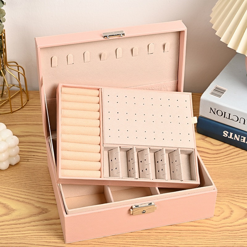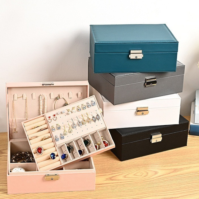 Caixa de Joias em Couro: 2 Camadas, Grande Capacidade, Ideal para Anéis, Brincos e Relógios -Q11