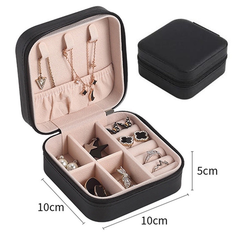 Material: PU leather Specification: 10*10*5cm Portable: portable travel Waterproof PU Leather Top Velvet Interior High Quality Zipper [Portable] - Size 10*10*5cm; This mini jewelry storage box is small and lightweight, and can be easily slipped into a bag when going out, or put in a travel or business suitcase. Tough and Durable]: The base is sturdy, well-structured and sturdy. The high quality zipper ensures that it is easy to open and close, very durable, and there is no need to worry about breakage. Our jewelry box protects all your beloved jewelry from dust, rain and scratches. [Practical Jewelry Storage Box Design]: Small size, big capacity! Meet your different needs. Keep your rings, earrings and other knick-knacks organized while traveling! This small jewelry box includes 2 detachable dividers, 6 loops, 3 necklace hooks and 1 elastic wall pocket. Package included: jewelry box *1