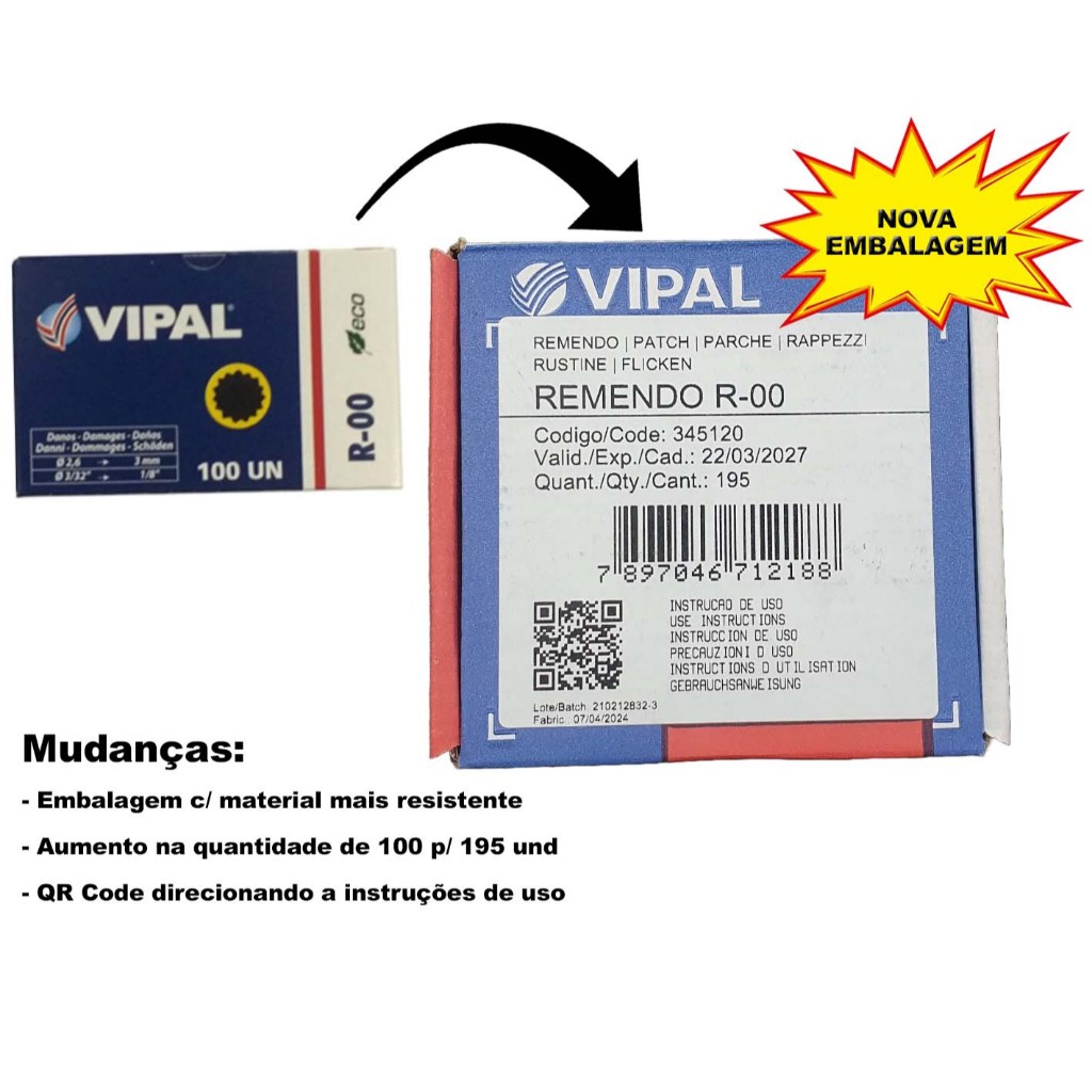 BUSCOU PNEUS - TUDO PARA PNEUMÁTICOS CONTEUDO DA EMBALAGEM 01 CX REMENDO 30MM R00 VIPAL - NOVA EMBALAGEM C/ 195 UNIDADES - Reparo para câmara de ar a frio - Possuem espessura extrafina e seu poder de expansão acompanha a elasticidade da câmara, não criando calosidades - Utilizam o sistema a frio de vulcanização (químico), que não submete as câmaras-de-ar ao calor, prolongando sua vida útil *GARANTIA DE 3 MESES ESTOQUE PARA ENVIO IMEDIATO PRODUTO NOVO *PRODUTO NOVO C/ GARANTIA DE 3 MESES CONTRA DEFEITOS DE FABRICAÇÃO *Nossa equipe está sempre disposta a tirar suas dúvidas, basta nos chamar no campo das perguntas. BUSCOU PNEUS – SÃO BERNARDO DO CAMPO - SP