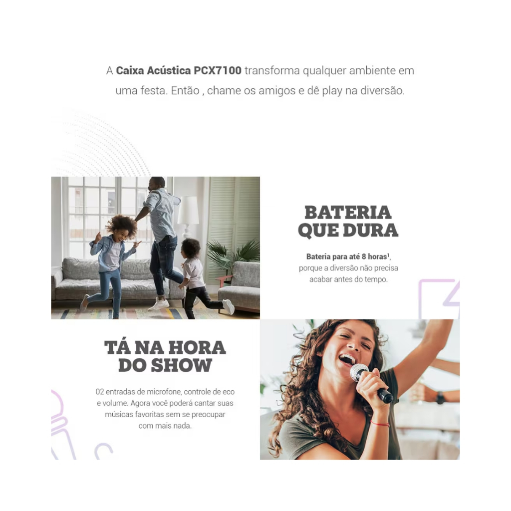 Caixa De Som Acústica Pcx7100 Flash Lights Bass 750w Philco PRODUTO BIVOLT --- Descrição --- - Tenha o melhor do som em suas comemorações com a Caixa de Som Amplificada 750W Philco Ex Bass PCX7100! - A potência de 750W garante maior qualidade sonora e seus Tweeter fazem a harmonização dos sons agudos, o que torna do modo mais confortável possível a reprodução das suas músicas e áudios preferidos. - Agite as comemorações e torne-as mais alegres e festivas com os 5 modos de iluminação da Caixa de som 750W Flash Lights! - Compartilhe suas melhores experiências ao lado das pessoas que gosta. As 2 entradas para microfone e o alto falante de 12’’ permitem dividir momentos especiais com a mais alta qualidade sonora. - Aproveite ainda da conectividade que o Bluetooth e a entrada USB te proporcionam! Interaja com mais velocidade e acessibilidade. - Garanta por mais tempo sua diversão com seus amigos e família, pois a bateria internada da Caixa Acústica Philco PCX7100 é recarregável e permite que ela tenha um excelente desempenho e com alta duração. --- Características --- • 750W RMS de potência; • Alto falante de 12” e tweeter; • Entrada USB para reprodução de músicas; • 2 Entradas para microfone; • Entrada auxiliar p2; • Bluetooth 5.0; • Rádio FM com sintonização entre 76-108MhZ; • Função repetição uma música, todas as músicas, pasta, random e sem repetição; • Rádio FM com sintonização automática e gravação de até 30 rádios • Navegação em pastas; • Compatível com arquivos MP3/WMA; • Bateria interna com capacidade de 4000mAh; • Display digital com backlight; • Função flash light com 5 modos de iluminação; • Alça e rodas para transporte; • Equalização pré-programada; • Botão ex bass; • Controle de eco para microfones; • Encaixe para colocar o produto em pedestal. --- Ficha Técnica --- • Modos Flash Lights: 5; • Modelo: PCX7100; • Potência (W): 750; • Conexões: Bluetooth; • Entrada Auxiliar: USB; • Funções: Equalizador; • Radio FM: Random; • Reforço de Graves: Repeat; • Quantidade de Alto Falantes: 1; • Quantidade de Tweeters: 1; • Acessórios: Cabo de Alimentação, Manual de Instruções; • Homologação Anatel: 59791909620. --- Dimensões --- - Do Produto - • Altura: 64,2 cm; • Largura: 38,8 cm; • Comprimento: 38,5 cm; • Peso: 11,45 kg. - Da Embalagem - • Altura: 72,1 cm; • Largura: 44,2 cm; • Comprimento: 44,2 cm; • Peso: 13,1 kg. — Perguntas Frequentes — O produto é original? Sim, pirataria é crime e deve ser denunciado à Shopee. Acompanha Nota Fiscal? Sim. O produto tem a garantia legal do fabricante? Sim. Consulte o campo garantia do anúncio. Estoque limitado – Garanta já o seu! Compre agora e aproveite nossas promoções especiais!