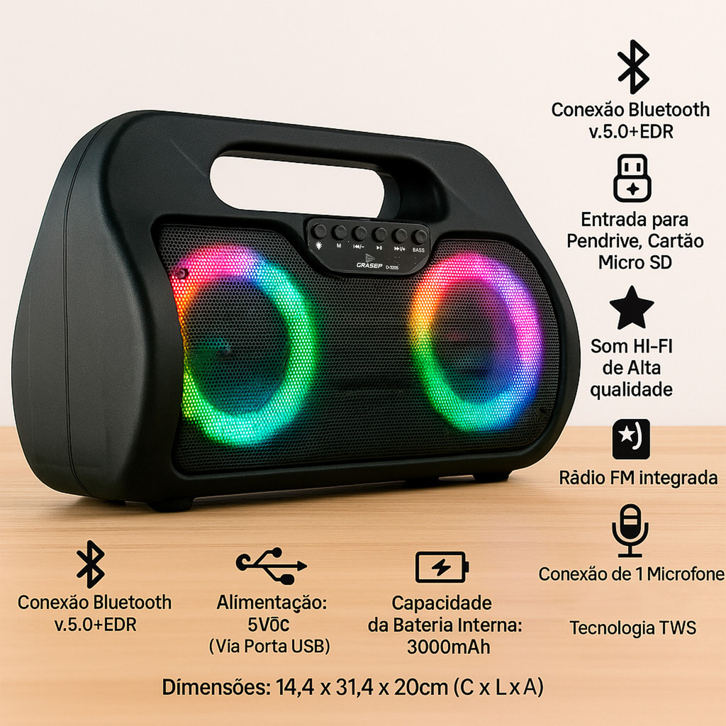 OFERTA RELÂMPAGO! GARANTA JÁ O SEU COM ENVIO RÁPIDO! 🚀🚀 Caixa de som portátil que combina design moderno com funcionalidades avançadas, perfeita para animar festas, reuniões ou momentos de lazer. Com potência de 20W RMS e iluminação LED RGB, ela oferece uma experiência sonora envolvente e visual marcante. ✨ Principais características: Conexão Bluetooth v.5.0+EDR Entrada para Pen drive, Cartão Micro SD Som HI-FI de Alta qualidade Rádio FM Integrada Conexão de 1 Microfone Fácil Instalação e Utilização Display LED Indicador de Funções Portátil, Possui Alça para Transporte Bateria Interna de Excelente Autonomia ✨ Especificações técnicas: Tecnologia TWS Potência: 20w RMS Alimentação: 5Vdc (Via Porta USB) Capacidade da Bateria Interna: 3000mAh Resposta de frequência: 80-20kHz Impedância: 4 Ohms Sensibilidade: > 80dB Diâmetro Alto falante: 7.62cm Dimensões (C x L x A): 15x32x20cm 📦 Itens na embalagem: 01 Caixa de Som 01 Cabo USB para recarga 01 Manual do usuário ✨ GARANTIA DE 30 DIAS!! ✨