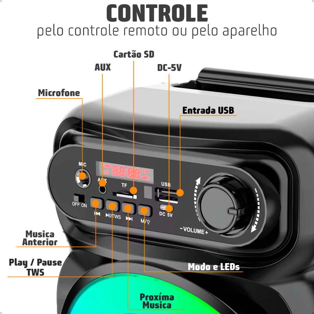 CAIXA DE SOM BLUETOOTH COM MICROFONE — Potente, LED e Perfeita para Karaokê! BENEFÍCIOS - Som alto e limpo para festas e eventos. - Microfone incluso para cantar e se divertir. - Bluetooth rápido e fácil de conectar. - LED colorido que anima qualquer ambiente. - Portátil com alça para levar onde quiser. - Bateria recarregável para mais praticidade. A Caixa de Som Bluetooth Amplificada Grande com Microfone é perfeita para quem busca potência sonora, praticidade e diversão em qualquer lugar. Com áudio forte e equilibrado, ela garante excelente desempenho tanto para músicas quanto para voz, tornando-se ideal para karaokê, festas e apresentações. Seu sistema Bluetooth permite conexão fácil com celulares, tablets e outros dispositivos, enquanto o microfone incluso transforma qualquer momento em um verdadeiro show. As luzes LED integradas elevam o clima da festa, sincronizando com o som e criando uma experiência visual envolvente. Com design portátil e alça reforçada, é fácil de transportar. Uma solução completa para quem quer som potente, mobilidade e entretenimento em um único produto. ESPECIFICAÇÕES - Potência: 16W RMS. - Alimentação: 5Vdc (Via Porta USB) - Capacidade da Bateria Interna: 1800mAh - Frequência de Resposta: 150 - 18000Hz - Impedância: 4 Ohms - Sensibilidade: > 80dB - Diâmetro do Alto-falante: 10.2cm - Dimensões: 17.0x17 .0x39.9 cm (C x L x A) - 3 Modos de Iluminação LED - Portátil com alça tira colo e alça para fácil transporte e suporte para celular - Entradas USB para Pendrive e Leitor de cartão SD - Som HI FI com alta fidelidade e sem distorções (Graves Reforçados) - Bateria de Lithium longa duração e sem distorções - Permite uso simultâneo enquanto carrega - Com entrada auxiliar para conectar com MP3 e MP4 - Conexão Bluetooth V.5.0+EDR - Fácil Instalação e utilização - Rádio FM integrado CÓDIGO DE HOMOLOGAÇÃO: 18547-23-13658 CONTEÚDO DA EMBALAGEM 1x Caixa de Som 1x Cabo USB X Micro USB V8 1x Cabo P2 x P2 1x Manual de Instruções 1x Microfone 1x Controle Remoto 1x Alça de Ombro