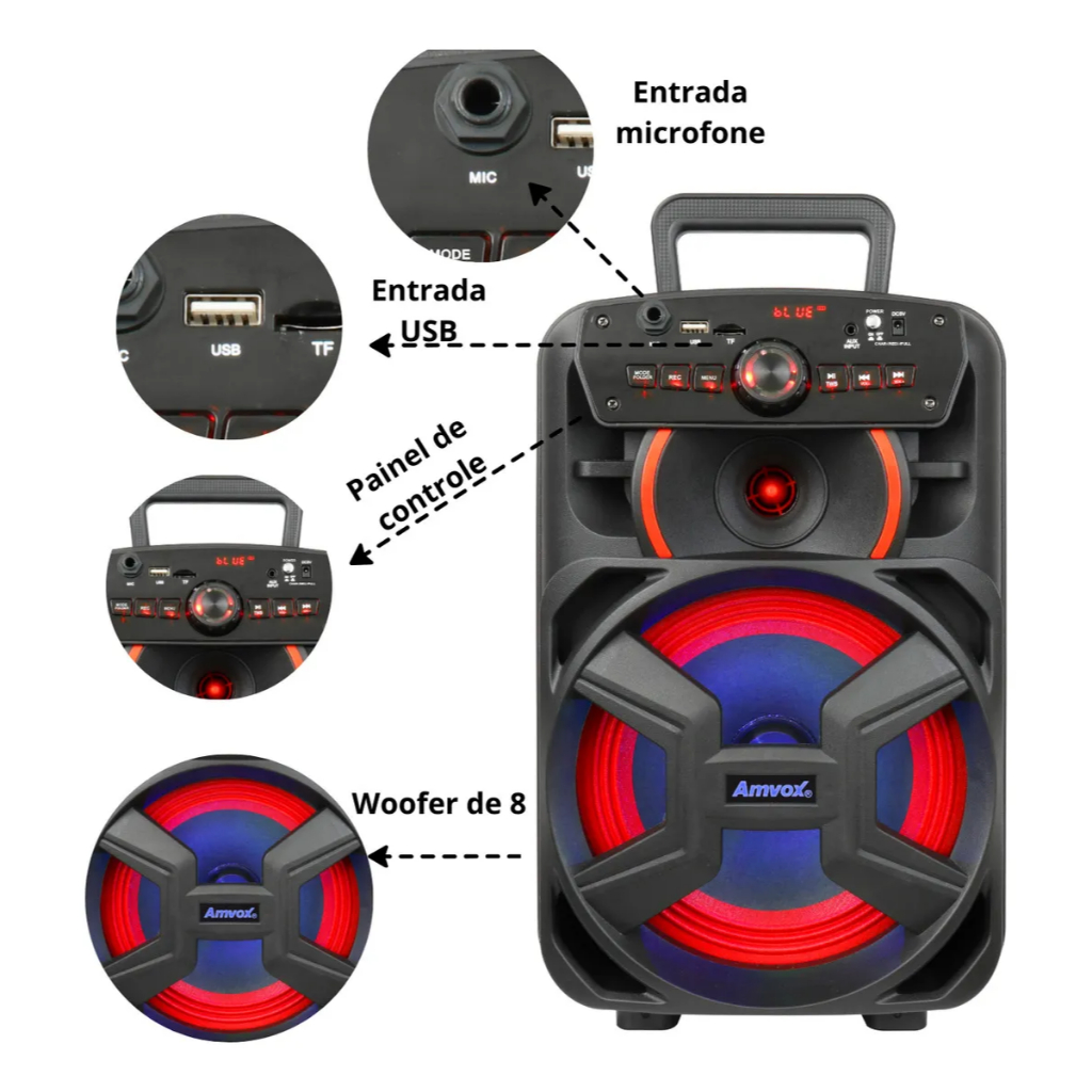 Sobre este item Potência de 220W RMS, Woofer de 8 polegadas, Tweeter de 4 polegadas, display e iluminação em LED Com a conexão Bluetooth você conecta seu smartphone na Caixa de Som Amplificada ACA 221 Gigante II e coloca suas músicas favoritas para tocar em instantes A Caixa de Som ACA 221 Gigante II é bivolt (110V/220V) e vem com bateria interna com capacidade para funcionar até 4 horas sem estar ligada a rede elétrica Possui Rádio FM, permite reproduzir músicas através de pen drive e cartão de memória. Tem também entrada AUX para conexão de microfone Surpreenda-se com a qualidade da Caixa de Som Amplificada Amvox ACA221 Gigante II