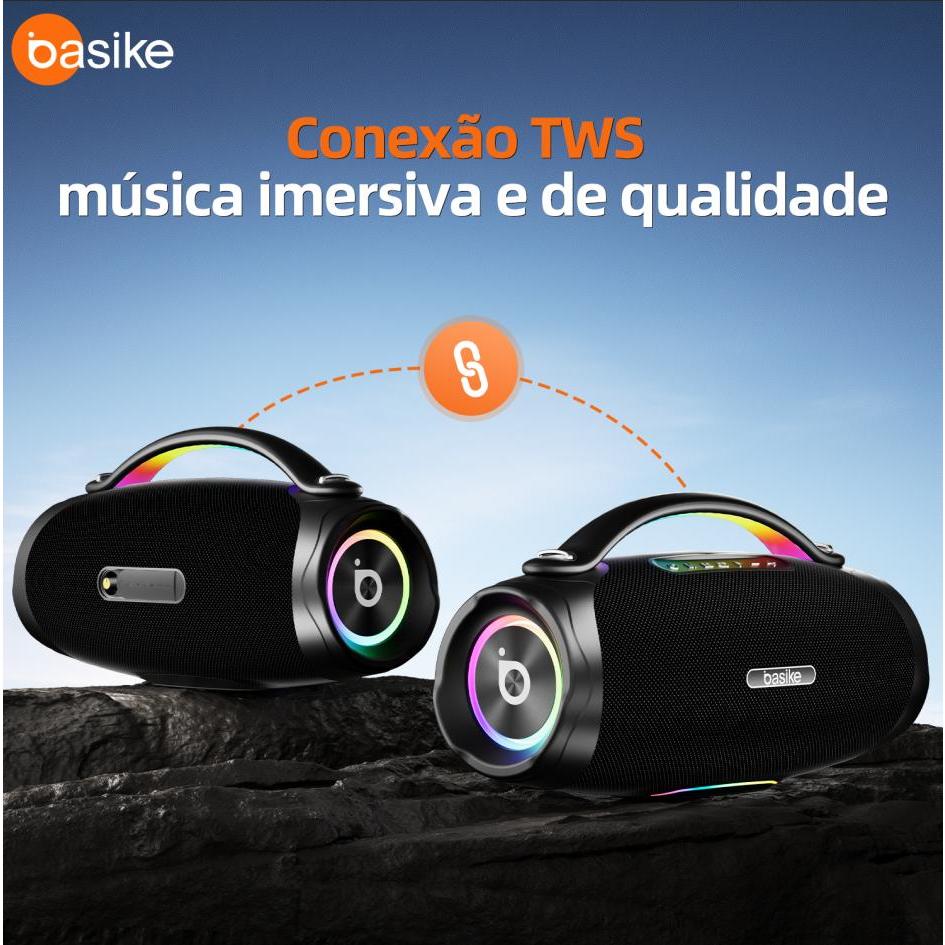 Bullets de destaque • Potência real de 300 W RMS com som forte e graves encorpados • Bateria de 30000 mAh com autonomia média entre 9 e 10 horas • Bluetooth 5.3 com conexão estável e alcance aproximado de 10 a 15 metros • Função TWS para emparelhar duas unidades e criar som estéreo mais envolvente • Proteção IPX6 que resiste à água e respingos, ideal para uso externo • Luzes RGB que acompanham a música e criam ambiente festivo • Entradas USB, cartão SD e auxiliar para ampliar compatibilidade • Design robusto e portátil com alça para transporte Pontos principais A Basike Ba-RAD181 é pensada para quem quer potência e mobilidade ao mesmo tempo. Entrega volume alto sem distorção, oferece autonomia prolongada e pode ser usada ao ar livre graças à proteção IPX6. Conecta rápido, funciona com vários tipos de dispositivos e ainda permite som estéreo ao emparelhar outra caixa igual. É uma escolha equilibrada para quem busca impacto, versatilidade e boa experiência sonora. Ficha técnica Modelo: Basike Ba-RAD181 Potência: 300 W RMS Bateria: 30000 mAh Autonomia: Aproximadamente 9 a 10 horas, dependendo do volume Conectividade: Bluetooth 5.3 Alcance: Cerca de 10 a 15 metros Entradas: USB, cartão SD, auxiliar 3,5 mm Recursos adicionais: Função TWS, iluminação RGB, power bank Proteção: IPX6 resistente à água Dimensões aproximadas: 49,6 x 21,6 x 26,9 cm Peso aproximado: 6,3 kg Itens inclusos: Caixa de som, alça de transporte, cabo USB-C, cabo auxiliar e manual Descrição para anúncio A Basike Ba-RAD181 foi criada para quem quer som forte, boa autonomia e facilidade para levar a música para qualquer lugar. Sua potência de 300 W RMS entrega graves profundos e áudio limpo mesmo em ambientes amplos. A bateria de 30000 mAh mantém a caixa funcionando por longos períodos, ideal para festas, encontros ou uso ao ar livre. A conexão Bluetooth 5.3 garante estabilidade e resposta rápida. Para quem deseja ainda mais imersão, a função TWS permite usar duas unidades e criar som estéreo mais encorpado. A certificação IPX6 oferece segurança contra água e respingos, permitindo uso próximo à piscina, na praia ou em ambientes externos. A Ba-RAD181 aceita USB, cartão de memória e entrada auxiliar, o que amplia bastante as formas de reprodução. As luzes RGB criam um efeito visual marcante que combina com festas e ambientes animados. O corpo resistente e a alça facilitam o transporte, tornando o equipamento ideal para quem está sempre em movimento.
