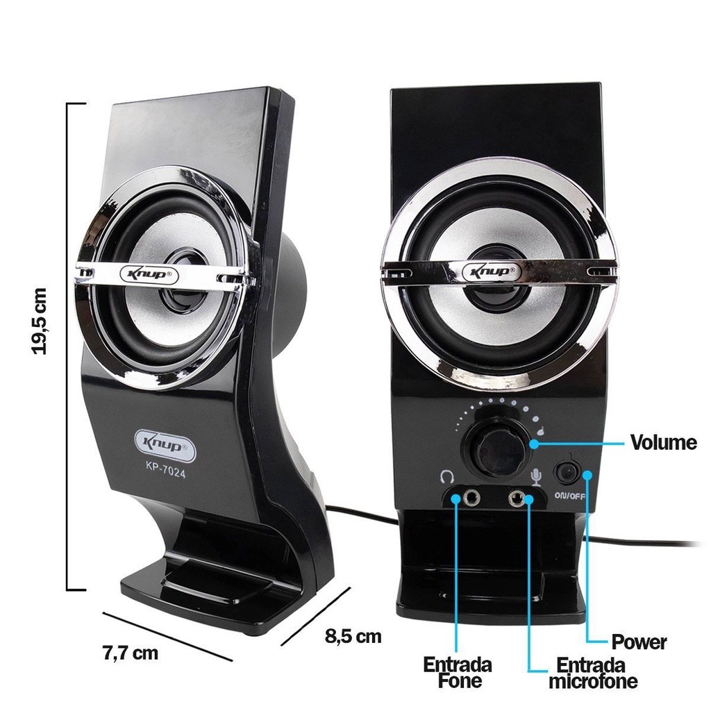 Tenha uma experiência incrível de uso. Com um excelente acabamento caracterizam como uma das melhores opções de caixa de som para computadores. A caixa de som possui dois alto-falantes, que garantem melhor performance, controle de graves e som bem distribuído e em alta qualidade. ESPECIFICAÇÕES: - Marca: Knup - Modelo: KP-7024 - Cor: Preto - Conexão: USB e P2 - Potência: 12W RMS - Voltagem: 5V - Frequência: 100 Hz - 20 Khz - Impedância: 4Ohms - Alimentação: USB DC 5v - Sensibilidade: 70db+-4dB - Conectores P2/3,5mm (áudio e microfone) - Material: Plástico rígido - Dimensões: 19 x 8 x 7 cm - Peso: 500 g ITENS INCLUSOS: 01 - Caixa De Som Para Pc Notebook P2 Usb Entrada Fone Microfone Knup KP-7024