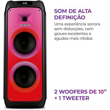A PartyBox AWS-PB-06 alia uma potência impressionante e a qualidade sonora do DNA japonês da AIWA. Com 300W RMS de potência, a caixa de som é composta por um sistema de 2 vias: os 2 woofers de 10’’ e o tweeter de 1,5’’ criam graves impactantes e agudos mais nítidos. A bateria também é um diferencial e pode durar até 20 horas ininterruptas fora da tomada. Incrível, né? Já a função RGB Color Lights, com o adicional de efeito flame, cria um cenário vibrante e repleto de cores. Saiba mais sobre a PartyBox AWS-PB-06 da AIWA: 300W RMS DE POTÊNCIA: A PartyBox AWS-PB-06 vai surpreender você: ela combina qualidade sonora e a impressionante potência de 300W RMS. É exatamente o som intenso que faltava para animar suas festas! SOM DE ALTA DEFINIÇÃO: A caixa de som AIWA reúne recursos que prometem entregar um som de excelente desempenho. Composta por sistema de 2 vias, conta com 2 woofers de 10’’ e 1 tweeter de 1,5’’ que, juntos, tecem graves vibrantes e agudos mais nítidos. Além disso, ainda possui resposta de frequência dinâmica de 50Hz a 20KHz. O resultado é uma sonoridade que vibra em perfeita harmonia! APP: CONTROLE TUDO PELO CELULAR: Assuma o controle da sua PartyBox ajustando, pelo aplicativo AIWA Brasil, funções como DJ Effects, equalização, modos e níveis de intensidade das luzes. Aproveite essa facilidade e adicione ao line-up uma dose extra de animação! 20 HORAS DE BATERIA: Sua festa pode ser em casa ou onde você quiser, já que a AWS-PB-06 foi criada para durar até 20 horas fora da tomada, variando de acordo com as condições de uso. RGB COLOR LIGHTS: Imagine um cenário vibrante e repleto de cores: isso é o que o RGB COLOR LIGHTS proporciona! Com a função Luzes Multicoloridas, a PartyBox ainda traz um toque especial: o efeito flame, que remete a uma chama acesa colorida. Prepare-se para um ambiente de balada, que não vai deixar ninguém parado! CONECTE MICROFONES E INSTRUMENTO E DÊ SEU SHOW: Você e seus amigos estarão reunidos em torno da PartyBox AIWA, prontos para soltar a voz, tocar instrumentos e se jogar nas suas músicas favoritas: a AWS-PB-06 possui 2 entradas para microfone, 1 para instrumento, além de entradas USB, auxiliar e micro SD. O palco perfeito para suas melhores performances! SOLTE A VOZ COM O VOICE CANCELLER: Com esse recurso, você pode remover o vocal da música e cantar no ritmo da canção utilizando um microfone. A deixa perfeita para organizar o karaokê, não é mesmo? BLUETOOTH 5.3: Com a versão 5.3 do Bluetooth, você pode curtir a música sem se preocupar com interferências no sinal. A caixa de som faz uma conexão mais estável e sem demora, além da economia da bateria. Conecte e solte seus movimentos! FUNÇÃO TWS: SOM EM DOSE DUPLA: Transforme sua festa em um momento único com a função TWS (True Wireless Sound): conectando duas PartyBoxes AWS-PB-06 é possível sincronizar músicas e luzes, além de duplicar o som e toda a vibração que ela traz. LEVE SUA FESTA COM VOCÊ: ALÇA + RODAS: Com alça de transporte e rodinhas, você pode levar sua caixa de som de maneira prática e segura. A ideia é espalhar sua música onde você estiver! Produto AWS-PB-06 Peso 15,50 Código ANATEL 06878-24-16931 Tempo de Bateria Volume 50% - Luzes ligadas – Até 5 horas / Volume 50% - Luzes desligadas- Até 20 horas / Volume 100% - Luzes ligadas – Até 2h30 minutos / Volume 100% - Luzes desligadas – Até 4 horas Tamanho do cabo 60cm Distância de conexão Bluetooth Até 10m Carregamento Cabo Entrada AC (127-220VAC 50/60Hz) Dimensão do Produto 87cm x 35,60cm x 35cm (AxLxP) TWS Sim Modos de luz 9 modos de luz Rádio FM Não Wooffer 2 x 10" Tweeter 1 X 1,5" Bateria Chumbo Ácido Formato de musicas Suportados MP3, WAV, FLAC e WMA Rodas para transporte Sim Entradas 1- USB | 1- Auxiliar.in (P2) | 1- Guitar.in (P10)| 2 – Microfone.in (P10) | 1 - Micro SD Resposta de Frequência Dinâmica 50 Hz -20 KHz Tempo de carregamento 5H Bluetooth 5.3 Potência da saída RMS 300W RMS Capacidade da bateria 12V, 7A Estamos à disposição para esclarecer qualquer dúvida. Atenciosamente, Equipe NegociuN!