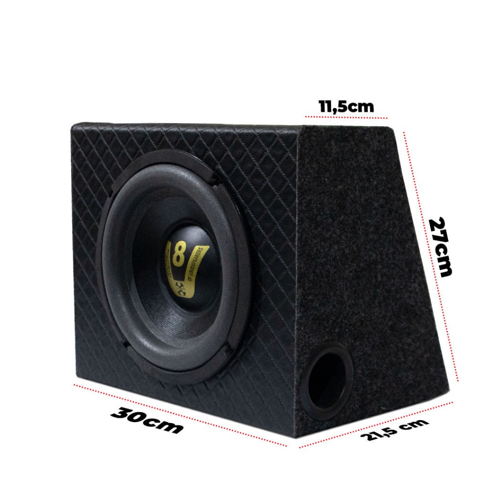 A Caixa Slim é um caixa com Sub Graves com potencia total de 200 WRMS. Com altíssima eficiência e baixa emissão de ruído, possui extrema qualidade de áudio e resposta de frequência (senoidal) de 20Hz a 100Hz. Super compacta pode ser instalada até em baixo dos bancos dianteiros do veículo, ideal para pick-ups, camionetes e usuários que não querem ocupar espaço no porta-malas. Alto Falante Subwoofer 8 Polegadas Especificações Técnicas Diâmetro Nominal: 8 Polegadas Potência RMS: 200W Carcaça em chapa metálica Impedância: 4 Ohms Bobina Simples Dimensões caixa: Altura: 27cm Largura: 30cm Profundidade Superior: 11cm Profundidade Inferior: 21cm