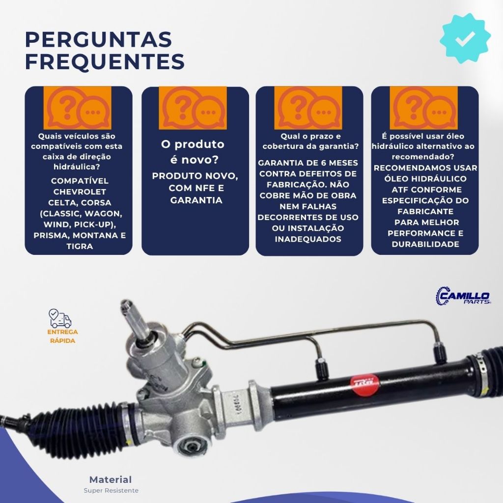 Bem vindo!! Você está em uma loja especializada em soluções automotivas seguras e confiáveis. Aqui, cada detalhe é pensado para cuidar do que move você: sua família, sua segurança e seus melhores momentos na estrada. 🚘 Dirigibilidade Renovada e Confiável para Seu Chevrolet! Transforme sua experiência ao volante com a Caixa Setor de Direção Hidráulica TRW, nova e original, desenvolvida por uma das maiores referências em qualidade e segurança automotiva. 🛠️ Acompanha axiais, coifas e pinhão liso chavetado ✅ Instalação fácil, encaixe perfeito e desempenho superior 🏭 Produzida com a confiabilidade da TRW, fornecedora original das montadoras 📋 Especificações Técnicas Marca: TRW Original Condição: Produto novo Garantia: 6 meses Inclui: 🔧 Axiais 🧰 Coifas ⚙️ Pinhão liso chavetado 🔎 Códigos de Referência 27479, JRP1381, 52121308, 7790000009, 26894 🚗 Compatibilidade Garantida ✅ Corsa – 1994 a 2001 ✅ Corsa Classic – 1994 a 2016 ✅ Corsa Wagon – 1994 a 2005 ✅ Corsa Pick-Up – 1994 a 2002 ✅ Prisma – 2006 a 2012 ✅ Celta – 2000 a 2016 ✅ Agile – 2009 a 2015 ✅ Montana (Nova) – 2011 a 2020 ✅ Tigra – 1994 a 1999 🌟 Benefícios ao Adquirir Este Produto 🏭 Qualidade TRW Original: Reconhecida mundialmente por confiabilidade e precisão 🛞 Direção suave e precisa: Elimina folgas e ruídos, oferecendo controle e conforto 🔩 Compatibilidade perfeita: Projeto específico para veículos Chevrolet 🛡️ Durabilidade e segurança: Materiais de alta resistência, maior vida útil 📅 6 meses de garantia: Garantia de fábrica com suporte técnico 📦 Conteúdo da Embalagem 1x Caixa de Direção Hidráulica ⚙️ Pinhão liso chavetado 🔧 Axiais 🧰 Coifas ⚠️ Recomendações e Garantia 👨🔧 Instalação profissional obrigatória Para garantir o desempenho e preservar a garantia 🔍 Troca em garantia: Sujeita à análise técnica e constatação de defeito 💸 Cobertura limitada: Garantia válida apenas para o produto – mão de obra não inclusa 📞 Ficou com dúvidas? Utilize o campo de perguntas ou fale com nossa equipe técnica especializada! 🛒 Garanta agora o melhor para seu Chevrolet! Adquira a Caixa Setor de Direção Hidráulica TRW, compatível com Corsa, Celta, Prisma, Montana, Agile e Tigra, em uma de nossas lojas oficiais: Camillo Parts, Genuine Automotive ou Edumac Parts ✅ Produto original ✅ Compra segura ✅ Qualidade e suporte técnico garantidos