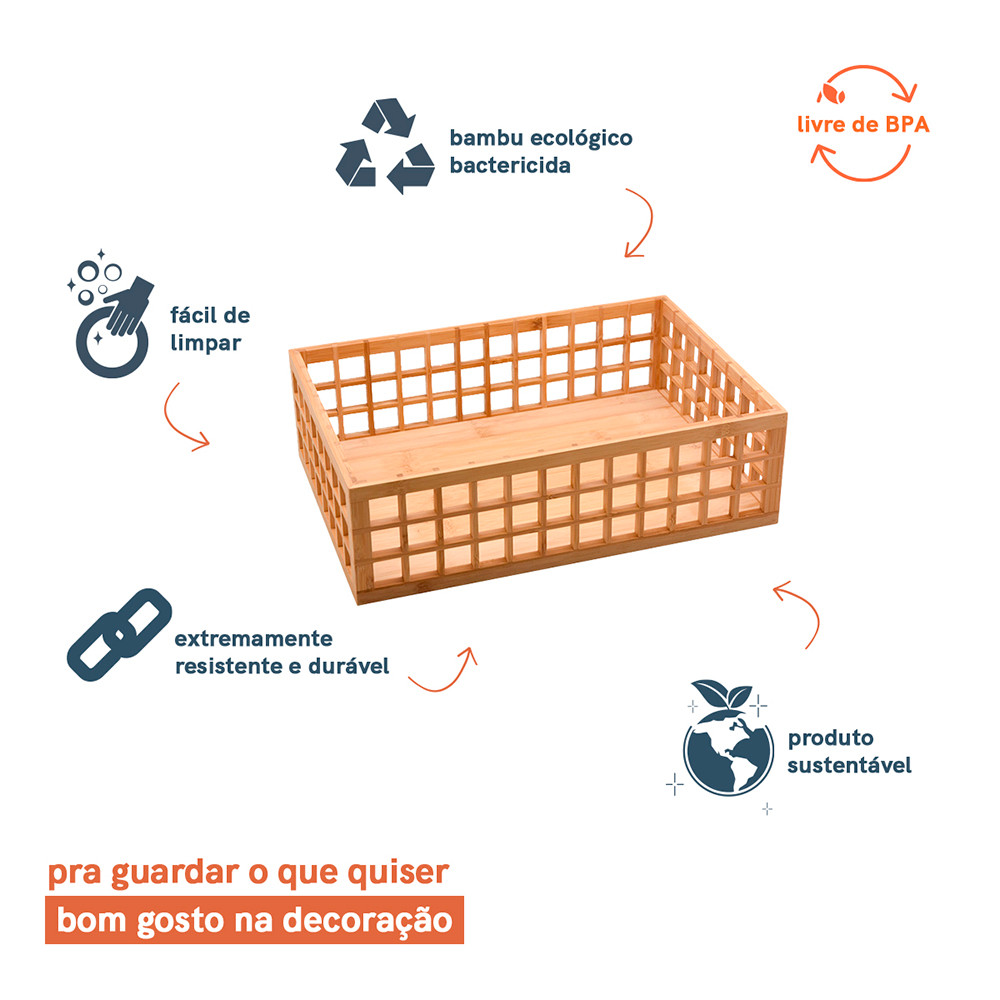 :: esse é o cesto vazado de bambu 38cm da oikos. :: multiuso: bacana pra guardar e organizar acessórios, brinquedos, perfumes, potes e mais! :: versátil: vai bem no quarto, no banheiro, na sala, na lavanderia e onde mais você quiser. :: empilhável: você pode colocar uma caixa em cima da outra, além de deixar tudo bem organizado, otimiza o espaço no armário e na bancada. dica extra: dá também para empilhar tamanhos diferentes, fica lindo e bem prático. :: melhor amigo da organização: o corpo de bambu vazado permite visualizar o conteúdo do cesto, facilitando o uso de objetos no dia a dia. :: feita de bambu: material leve e ecologicamente correto. :: durável e higiênico: o bambu é resistente e tem propriedades que evitam a proliferação de bactérias, só precisa lavar e secar de acordo com as recomendações, combinado?