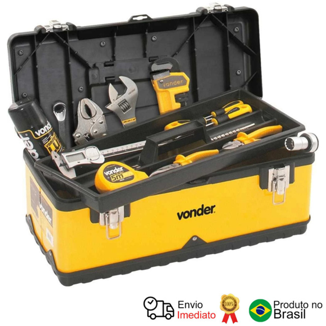 Caixa para ferramentas, plástica/metálica, 38,0 cm x 16,0 cm x 18,0 cm, CMV 0380, VONDER. Possui partes em polipropileno, tampa com estrutura reforçada e bandeja plástica removível. Indicada para guardar, organizar e transportar ferramentas diversas. Modelo: CMV 0380 Material (tipo/composição): Aço carbono e polipropileno Cor da caixa: Preta e amarela Comprimento: 38,0 cm Largura: 16,0 cm Altura: 18,0 cm Capacidade de carga (kgf): 8,0 kgf Massa aproximada (peso) (kg): 1,67 kg Observação: Foto meramente ilustrativa, ferramentas e acessórios não acompanham o produto. Conteúdo da Embalagem: 1 Caixa plástica/metálica para ferramentas.