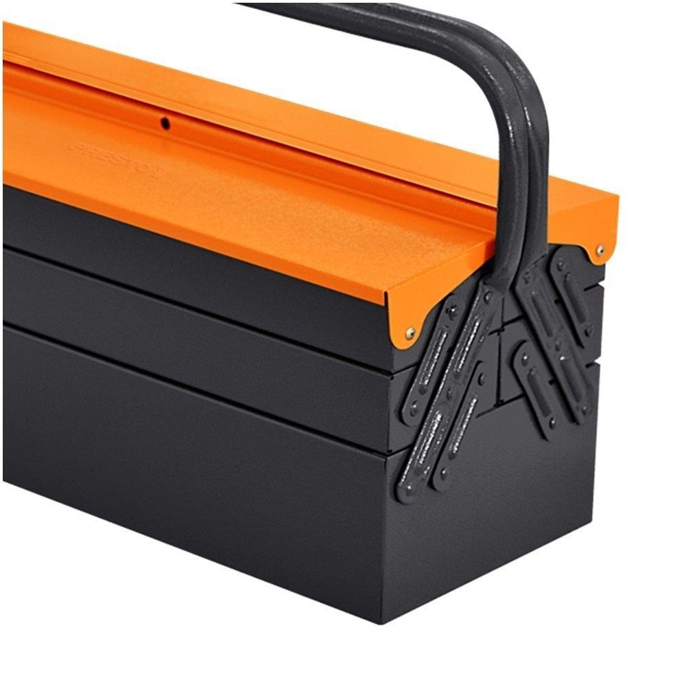 A Caixa de ferramentas sanfonada totalmente confeccionada em aço reforçado, é perfeita para transportar suas ferramentas e mantê-las sempre organizadas. - Resistente: Produzida em aço. - Durável: Tratamento antiferrugem, pintura eletrostática a pó. - Excelente custo-benefício. - Segurança: Furação na tampa para cadeado. - Abertura total das gavetas. :: Cor: Laranja e cinza. :: Espessura da chapa da coluna: 0,46mm :: Gavetas: 05. :: Acabamento: Antiferruginoso. :: Peso (kg): 25kg. :: Dimensões (C x L x A) (cm): 50 x 20 x 21. - Garantia: 1 ano. - Marca: PRESTO INDUSTRIAL