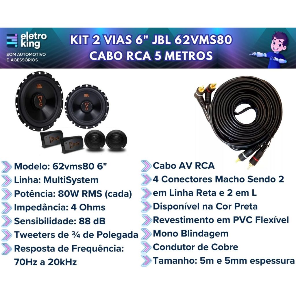 Caixa JBL Ativa Amplificada SW8A-MS 200w + Kit 2 Vias JBL 62VMS80 180W + RCA Este conjunto de áudio JBL oferece uma experiência sonora excepcional para o seu veículo. A Caixa Ativa Amplificada SW8A-MS, com 200W de potência, proporciona graves potentes e vibrantes. Complementando o sistema, o Kit 2 Vias JBL 62VMS80, com 180W de potência, oferece agudos cristalinos e médios precisos para uma reprodução de áudio balanceada. O cabo RCA incluído assegura uma conexão eficiente e de alta qualidade entre os componentes. Este kit é a escolha ideal para quem busca um upgrade premium no sistema de áudio do carro, garantindo uma experiência musical envolvente. Especificações Técnicas: Caixa Amplificada Jbl Slim Sw8a-MS Subwoofer 200w + 2x100w Lançamento SUBWOOFER: • 8 Polegadas, 2 Ohms • Potência RMS: 200W 2 Ohms • Resposta de frequência: 20Hz - 150Hz • Sensibilidade de entrada, alto nível: 0,5V • Sensibilidade de entrada, baixo nível: 100mV • Filtro Low-Pass: 50Hz - 150Hz • Bass Boost: + 12dB • Filtro Subsônico: 20Hz • Impedância: 2 Ohms FRONTAL (ESTÉREO): • Potência RMS: 2x100W 2 Ohms • Resposta de frequência: 30Hz - 20KHz • Sensibilidade de entrada, alto nível: 1,0V • Sensibilidade de entrada, baixo nível: 300mV • Bass Boost: + 6dB • Filtro Subsônico: 30Hz • Impedância: 2 Ohms Kit Duas Vias Jbl Selenium Multisystem 62vms80 6 Pol 160wrms • Linha: MultiSystem • Modelo: 62vms80 • Alta Qualidade de Som • Excelente Desempenho. • Atualização de ID Alinhado a Produtos Globais • Alto Falante 6 Polegadas • Potência: 80W RMS (cada) • Tweeters de ¾ de Polegada • Crossover de 3000Hz • Impedância: 4 Ohms • Sensibilidade: 88 dB • Resposta de Frequência: 70Hz a 20kHz Cabo Rca 5 Metros Preto Conector Banhado A Ouro • Cabo AV RCA • 4 Conectores Macho Sendo 2 em Linha Reta e 2 em L • Disponível na Cor Preta • Revestimento em PVC Flexível • Mono Blindagem • Condutor de Cobre Isento de Oxigênio (OFHC) • Alta Capacidade de Condução • Diminui Interferências na Transmissão de Áudio ou Vídeo • Medidas Aproximadas da Espessura: 5mm • Comprimento Aproximado: 5 Metros Conteúdo da Embalagem: • 01 Caixa Amplificada JBL Ativa SW8A-MS • 01 Cabo Para Instalação • 01 Controle Remoto Para Subwoofer • 02 Alto Falantes 6 Polegadas • 02 Tweeter • 02 Crossover • 01 Cabo RCA 5 Metros • Manual e Certificado de Garantia Importante: • Garantia de 273 Dias. • Valor Kit