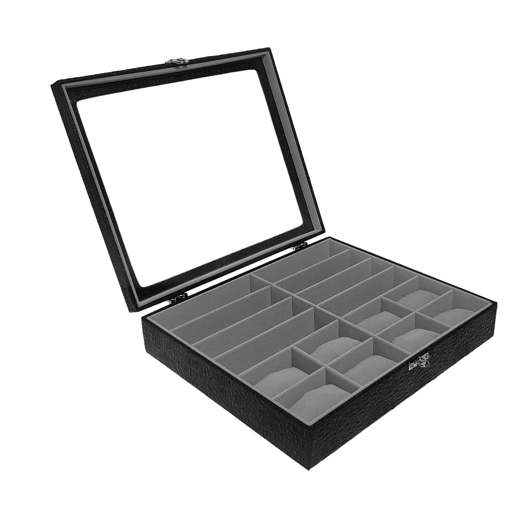 Caixa Maleta Estojo 8 Óculos E 8 Relógios Com Tampa de Vidro Interno Cinza Aveludado