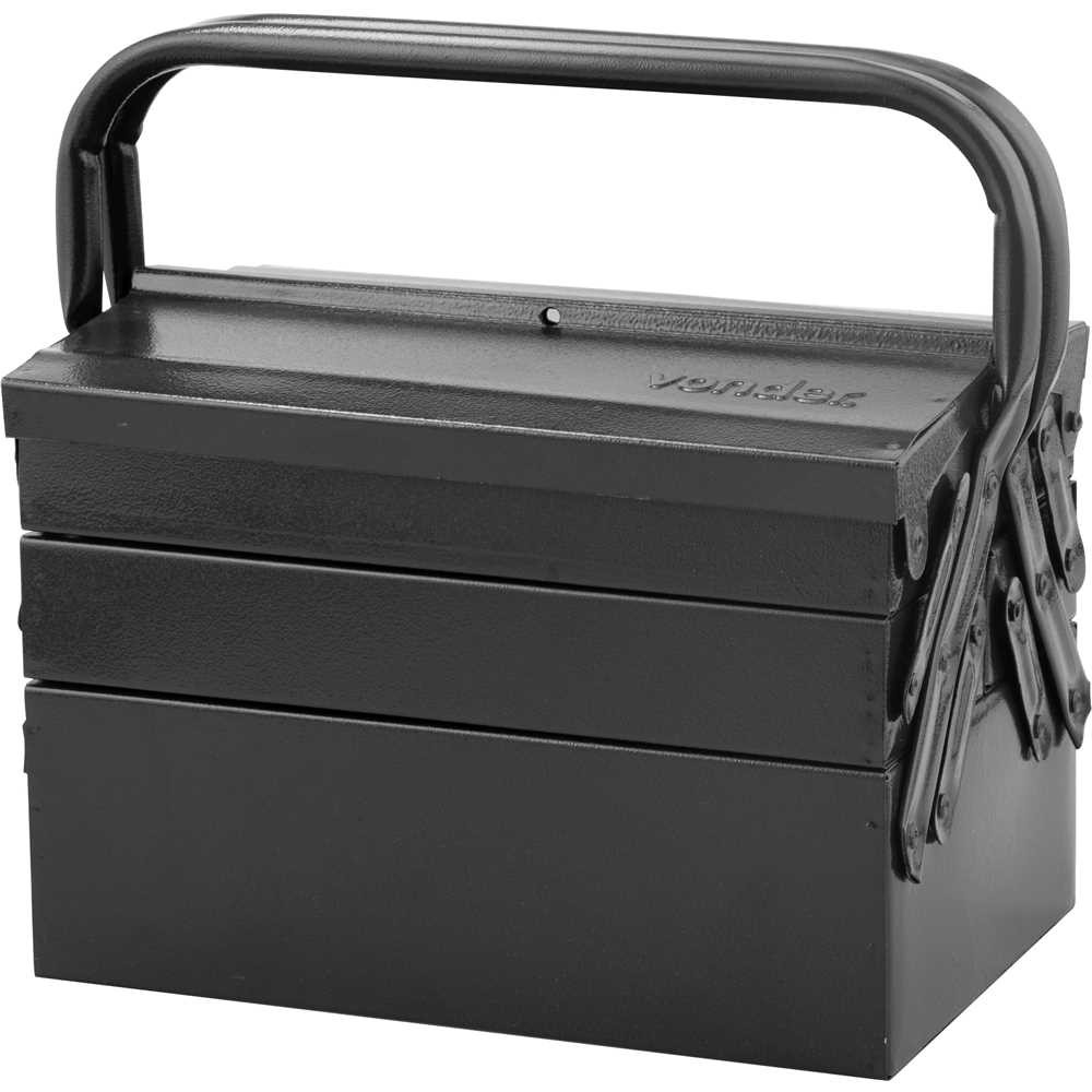 Caixa Metálica Sanfonada Para Ferramentas, Com 5 Gavetas, 30 Cm X 19 Cm X 20 Cm, Vonder Possui 5 gavetas, sendo: 1 fixa e 4 articuladas, além de alça fixa para transporte e porta-cadeado. Indicada para acondicionamento de ferramentas e afins. Especificações Técnicas: Material (tipo/composição): Chapa de aço Tipo: Sanfonada Comprimento: 30,0 cm Largura: 19,0 cm Altura: 20,0 cm Altura com alça: 30,0 cm Capacidade de carga (kgf): 28 kgf Cor: Preta Massa aproximada (peso) (kg): 2,95 kg Conteúdo da Embalagem: 1 Caixa metálica para ferramentas.