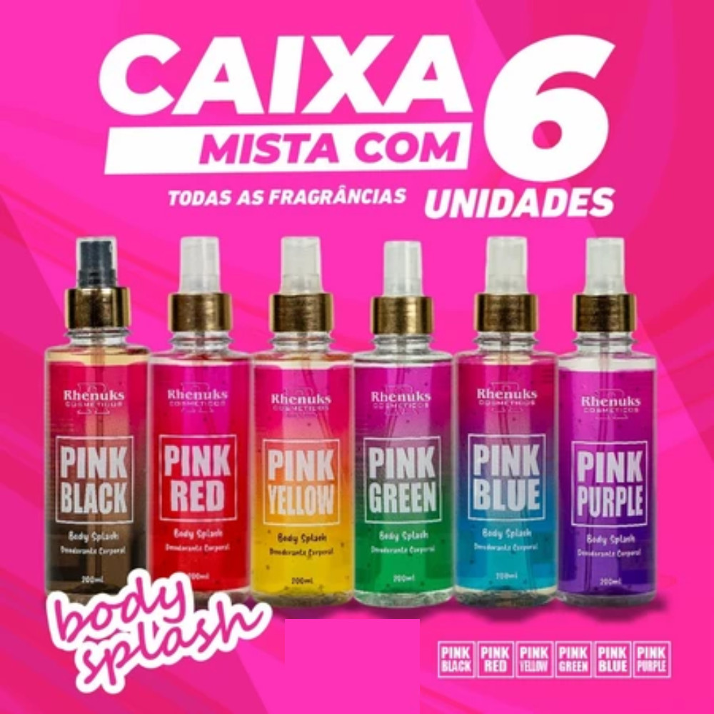 CAIXA MISTA BODY SPLASH RHENUKS 6 FRAGRANCIAS O Body Splash desodorante corporal RHENUKS é ideal para perfumar a pele com um toque de suavidade, além de sua fragrância encantadora também oferece propriedades desodorantes, ajudando a manter a sensação de limpeza e frescor ao longo do dia. Sua fórmula suave e não irritante é ideal para todos os tipos de pele, proporcionando uma experiência agradável após o banho ou sempre que desejar um impulso de energia. Modo de usar: Borrife na pele a uma distância de aproximadamente 30 cm. Reaplique sempre que desejar. Elaborado com seis fragâncias, vamos conhecer cada uma delas. Pink green - com notas de saída de champagne e notas frutadas. Pink Purple - com notas de saída de mandarina, morango e grapefruit. Pink Blue - suas notas de saída tem kiwi, lichia vermelha e marmelo Pink Yellow - com notas de saída quem lembram Néroli ,Limão, Amalfi , Framboesa. Pink Black : com notas de saída de Amêndoa, e café Pink Red :com notas de saída de Cassis ou Groselha preta e pêra. Contém: 6 frascos plásticos de Body Splash desodorante corporal de 200 ml cada. Produto original. Envio rápido.