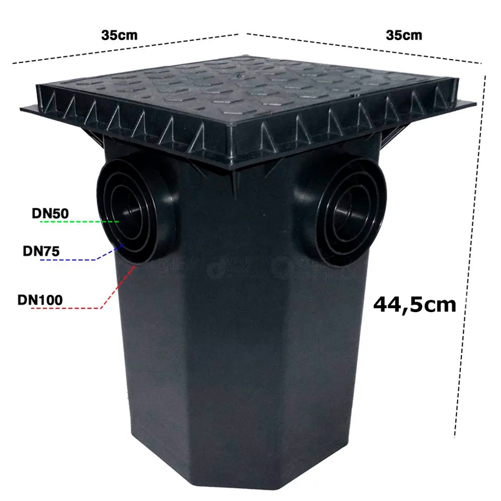 COMERCIAL VIPASA DISTRIBUIDORA. CAIXA MULTIPLA P/ INSPECAO COM TAMPA 35X35X44,5CM (6090 11) / ROMA . 6090 11 – Caixa múltipla p/ Inspeção (ou Passagem) c/ Tampa Caixa Múltipla 22 litros. Tamanho: 35 x 35 x 44,5cm. 4 posições de entrada, ambas com encaixes para tubos de 100, 75 e 50mm e 1 posição de saída inferior para tubos de 100mm. Injetada em plástico PP de alta resistência. Versátil, resistente e de fácil instalação e manutenção. Pode ser utilizada para rede de esgoto, coleta de água, passagem de cabos elétricos ou de inspeção. Suporta até 300kg. Caixa de Passagem ou Inspeção com Tampa Quadrada 35x35x44,5 cm - Roma Caixa múltipla para inspeção ou passagem, pode ser utilizada para coletar a água proveniente da sua rede de esgoto, também pode ser utilizado para coleta de água pluvial ou para passagem de cabos elétricos ou de telefonia subterrânea. É de fácil instalação, não da infiltração com isso evita a contaminação do solo. 4 posições de entrada, ambas com encaixes para tubos de 100, 75 e 50mm e 1 posição de saída inferior para tubos de 100mm. Injetada em plástico PP de alta resistência. Versátil, resistente e de fácil instalação e manutenção. Pode ser utilizada para rede de esgoto, coleta de água, passagem de cabos elétricos ou de inspeção. Características: Produto Caixa Múltipla para Passagem e Inspeção Modelo: Caixa octogonal com tampa quadrada Material: Polipropileno Cor: Preto Entrada: 4 entradas com opções de DN50, DN75, DN100mm cada uma. Saída: 1 saída DN100 Altura: 445 mm Largura: 350 mm Comprimento: 350 mm Tampa: 300 mm x 300 mm Peso do Produto: 2,5 Kg Suporta até 300 kg Código: 12.1.609011 Obs. Produto vendido por unidade. Imagem meramente ilustrativa. Atenção: Não nos responsabilizamos pela má aplicação/instalação do produto. COMERCIAL VIPASA DISTRIBUIDORA.