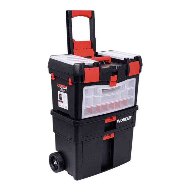 CAIXA DE FERRAMENTAS COM RODAS DE NYLON 24.1/2" WORKER Fabricada com polipropileno injetado; Rodas de poliamida; 2 compartimentos na tampa para armazenamento de peças pequenas; Possui rodas para movimentação e alça dobrável; 1 organizador frontal; 2 gavetas; Bandeja interna removível. *Não acompanha ferramentas. Garantia do produto: 90 dias contra defeitos de fabricação concedido pelo fabricante.