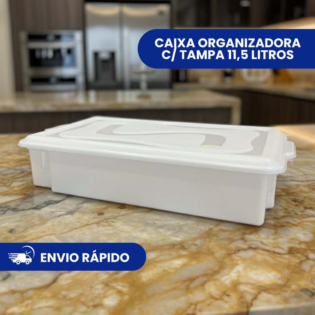 Caixa Organizadora 11,5L com Tampa – Praticidade e Organização para Sua Casa Mantenha sua casa ainda mais organizada com a Caixa Organizadora 11,5L. Perfeita para armazenar alimentos e diversos itens, ela oferece praticidade no dia a dia, com a facilidade de empilhamento para otimizar o espaço quando em uso e o encaixe perfeito na hora de guardar. Feita de polipropileno resistente e livre de Bisfenol-A (BPA), oferece segurança e durabilidade. Características principais: Capacidade de 11,5L ideal para armazenar alimentos e outros itens de diferentes tamanhos. Tampa prática que mantém os itens armazenados frescos e protegidos. Feita de polipropileno, material resistente e durável. Livre de Bisfenol-A (BPA), garantindo maior segurança para você e sua família. Dimensões: 52,5 x 31,5 x 11,0 cm – tamanho perfeito para organizar sua casa de forma eficiente. Cor branca, discreta e elegante, que se adapta a qualquer ambiente. Compre direto da fábrica e aproveite os melhores preços! Dúvidas? Fale conosco pelo chat, estamos à disposição para ajudar! Transforme a organização da sua casa com qualidade, praticidade e estilo!
