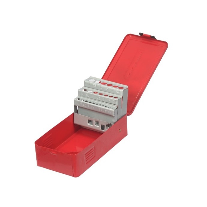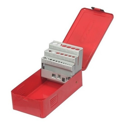 CAIXA METÁLICA ORGANIZADORA DE BROCAS ***ATENÇÃO, NÃO ACOMPANHAM AS BROCAS Estojo com 25 furos para organizar suas brocas de 1,0 até 13,0mm Não acompanha as brocas. somente estojo vazio Tamanho do estojo: 05cmX10cmX19Xcm