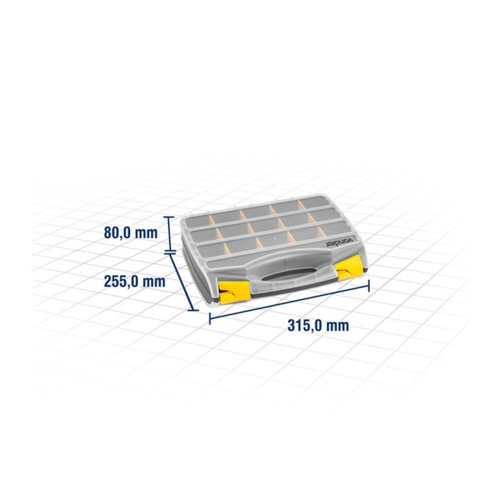 Indicado para acondicionar peças e acessórios, material de pesca, parafusos, pregos, porcas, remédios, entre outros Características: - Marca: Vonder - Modelo: 6364010010 Características Principais: - Possui 32 compartimentos - Com 24 divisões removíveis e adaptáveis - Alça para transporte e 4 travas Especificações Técnicas: - Comprimento do organizador para ferramentas:315,0 mm - Largura do organizador para ferramentas:255,0 mm - Altura do organizador para ferramentas:80,0 mm - Material do organizador para ferramentas: Polipropileno - Cor do organizador para ferramentas: Preto/amarelo e transparente - Capacidade de carga (kgf):5 kgf Conteúdo da Embalagem: - 1 Organizador plástico