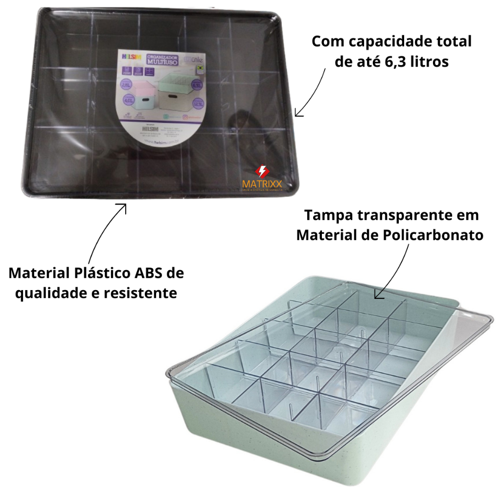 Caixa organizadora desmontável com divisórias Material: Plástico ABS resistente e Policarbonato transparente. Dimensões: COMPRIMENTO 35 cm x LARGURA 26 cm x ALTURA 7,5 cm Capacidade: 6,3 litros. Durabilidade e Transparência: Fabricada em Plástico ABS resistente, com tampa e divisórias em Policarbonato transparente. Grande Capacidade: Armazene até 6,3 litros de itens essenciais. Configuração Personalizada: Divisórias removíveis permitem ajustar o espaço conforme suas necessidades. Empilhamento Seguro: Tampa com borda estendida possibilita empilhamento seguro de outras caixas da linha UTILE da Helsim. ENVIO IMEDIATO.