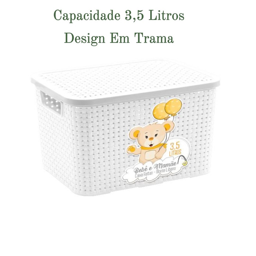 Caixa Organizadora Monte Líbano Rattan com Tampa 3,5 Mantenha tudo no lugar com muito mais praticidade e charme! A Caixa Organizadora Monte Líbano é perfeita para quem busca funcionalidade sem abrir mão da beleza na organização do lar. Seu design delicado no estilo rattan confere um toque sofisticado ao ambiente, ao mesmo tempo em que oferece alta durabilidade e facilidade no dia a dia. Com capacidade de 3,5 litros, é ideal para armazenar pequenos objetos como produtos de higiene do bebê, fraldas, acessórios de cabelo, medicamentos, materiais de escritório, maquiagem ou o que mais você precisar deixar sempre à mão. A estrutura com furinhos garante boa ventilação, evitando odores e mantendo os itens internos bem conservados. Além disso, a tampa com encaixe firme protege os objetos contra poeira e sujeira, enquanto as aberturas laterais proporcionam um manuseio fácil e seguro, facilitando na hora de retirar ou transportar a caixa. Características: • Capacidade de 3,5 litros – perfeita para pequenos objetos • Estrutura com furinhos, que garantem ventilação interna • Tampa com encaixe seguro, mantendo tudo protegido • Aberturas laterais para facilitar o manuseio • Medidas aproximadas: 21 cm x 16 cm x 14 cm • Ideal para usar no quarto do bebê, banheiro, lavanderia Organização com estilo e praticidade para facilitar o seu dia a dia! Informações Adicionais: Tamanho: Único Cores: Branco Referência: BM2102 Marca: Monte Líbano