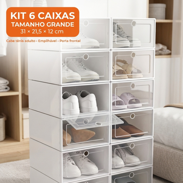 ✨ KIT CAIXA ORGANIZADORA DE SAPATOS – A SOLUÇÃO DEFINITIVA PARA SEU CLOSET! ✨ Cansado de ver seus tênis espalhados ou guardados em caixas de papelão que dificultam a visualização? Nosso Kit de Caixas Organizadoras é perfeito para quem busca um ambiente limpo, moderno e com 100% de visibilidade. Graças ao seu design inteligente e empilhável, você economiza espaço e mantém seus calçados protegidos contra poeira e umidade. É a praticidade que falta no seu dia a dia! ✅ VANTAGENS E BENEFÍCIOS: - Design Empilhável e Estável: Encaixe seguro para empilhar várias unidades e aproveitar a altura do seu armário ou canto do quarto. - Tampa Flip Frontal: Acesse seu calçado favorito em segundos, sem precisar desempilhar as outras caixas. - Transparência Total: Encontre o par que você quer sem precisar abrir caixa por caixa. - Ventilação e Proteção: Material que evita o mofo e a umidade, preservando a vida útil do seu tênis ou sapato. - Montagem Sem Ferramentas: Rápido, prático e intuitivo. - Multiuso: Além de sapatos, é ideal para organizar cosméticos, brinquedos, maquiagem ou material de escritório. 📋 ESPECIFICAÇÕES TÉCNICAS: - Material: Plástico PP resistente e durável. - Dimensões (cada caixa): 31 cm (Comprimento) x 21,5 cm (Largura) x 12 cm (Altura). - Cores: Transparente com detalhes variados. 📦 ESCOLHA SEU KIT (VARIAÇÕES): - Opções de 06, 10, 12 ou 24 unidades. 🚚 ENVIO IMEDIATO DE SÃO PAULO – ORGANIZE SUA CASA COM QUALIDADE E PREÇO JUSTO!