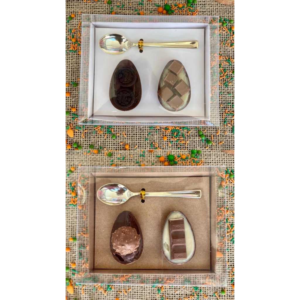 Caixa para Ovo de Colher 2 ovos 50gr Branca ou Kraft Fabricada em Papel Triplex 250gr Tampa em Acetato com encaixe Feita sob medida para a forma da Porto Formas e Bwb Embalagens *Colher não inclusa *Ovo demonstrativo, não incluso no produto *ESCOLHA A COR DESEJADA NA HORA DA COMPRA*