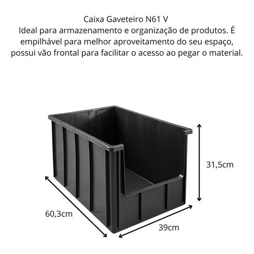 Caixa Plástica Gaveteiro - Resistente, Empilhável e Versátil Ideal para armazenamento e organização de produtos. É empilhável para melhor aproveitamento do seu espaço, possui vão frontal para facilitar o acesso ao pegar o material. Aplicações recomendadas: indústrias em geral, malharias, almoxarifados, centros de distribuição, entre outros segmentos. Capacidade: 61 litros Peso: 2,35 kg Dimensões externas (A x L x C): 31,5 x 39 x 60,3 cm Dimensões internas (A x L x C): 31 x 35,5 x 56 cm Dimensões abertura: 18,5 x 28,4 cm (alt x larg) Cores disponíveis: Preto - TAMPA NÃO INCLUSA - Empilhável - Abertura em V - Robusta e durável - Fácil de manusear e limpar Entre em contato para mais informações ou para solicitar um orçamento personalizado!