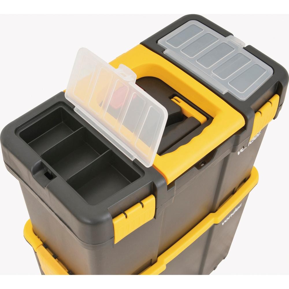 Conteúdo da embalagem 1 Caixa plástica com rodas Aplicações e dicas de uso Indicada para organizar, armazenar e transportar ferramentas, peças e acessórios em geral Destaques e diferenciais Possui tampa com estrutura reforçada com 2 compartimentos, bandeja para ferramentas removível, alça dobrável, rodas para transporte e travas reforçadas DETALHES TÉCNICOS Comprimento da caixa plástica: 460,0 mm Largura da caixa plástica: 260,0 mm Altura da caixa plástica: 625,0 mm Material da caixa plástica: Polipropileno Cor da caixa plástica: Preta e amarela Capacidade de carga: 27 kg