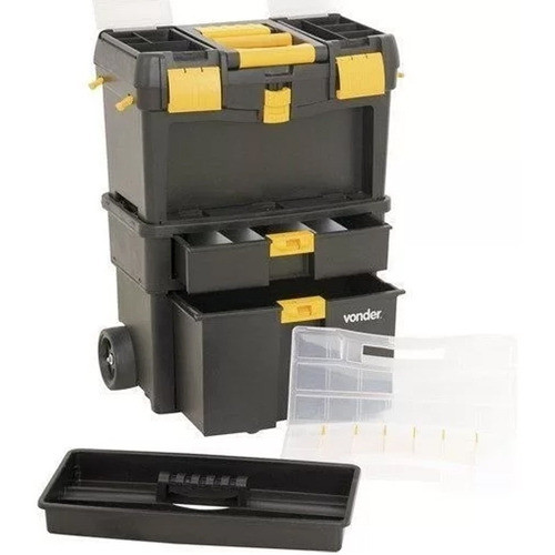 Caixa de Ferramentas Plástica CRV 0100 Vonder - Indicada para organizar, armazenar e transportar ferramentas, peças e acessórios em geral, múltiplas divisórias A Caixa Plástica com rodas CRV0100 da Vonder é ideal para a organização das suas ferramentas. Indicada para organizar, armazenar e transportar ferramentas, peças e acessórios em geral. Possui tampa com estrutura reforçada com 2 compartimentos, bandeja para ferramentas removível, bandeja frontal destacável com múltiplas divisórias, alça dobrável, rodas para transporte e travas reforçadas além de ganchos na lateral superior para enrolar extensão elétrica de cabo fino. Características Gerais do Produto: Alça para Transporte: Sim Capacidade de carga caixa inferior: 11 kg Capacidade de carga caixa superior: 11 kg Compartimentos: Múltiplas divisórias Ganchos: Laterais Número de Bandejas: 2 Bandejas Rodas: Sim Tipo de Bandeja: Removível / Destacável Trava: Sim Cor Predominante: Preto / Amarelo Material: Polipropileno Altura: 62 cm Profundidade: 26 cm Largura: 46cm Peso: 8,340 kg Marca: Vonder Modelo: CRV 0100 Acompanha o produto: 01 - Caixa de Ferramentas Plástica CRV 0100 Vonder