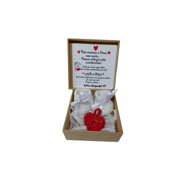 NÃO PERSONALIZAMOS FRASES POIS OS PRODUTOS ESTÃO PRONTOS PARA ENVIO. PRODUTOS PRONTOS PARA ENVIO. KIT CONTÉM: 1 caixa em mdf cru medindo 10x10x5cm (não disponibilizamos de outras cores ou modelos de caixas). 1 Par de sapatinhos feito a mão em crochê com linha antialérgica ideal para bebês recém nascidos. 1 Chaveiro em formato de coração feito em fio de malha medindo 5x4cm