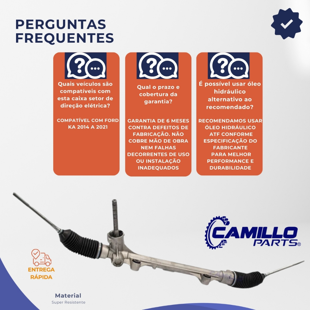 Bem vindo!! Você está em uma loja especializada em soluções automotivas seguras e confiáveis. Aqui, cada detalhe é pensado para cuidar do que move você: sua família, sua segurança e seus melhores momentos na estrada. 🚗 Dirigibilidade Renovada e Precisa para Seu Ford New Ka! Melhore sua experiência ao volante com a Caixa Setor de Direção Mecânica para Coluna Elétrica da Genuine Automotive, referência em qualidade no mercado de autopeças. 🔧 Acompanha axiais, coifas e pinhão liso chavetado, oferecendo um kit completo, pronto para instalação e com desempenho garantido. ✅ Desenvolvida com tecnologia de ponta e rigorosos padrões de qualidade, essa peça proporciona uma direção suave, precisa e segura, além de garantir maior durabilidade para o seu veículo. 📋 Especificações Técnicas 🏷️ Marca: Genuine Automotive 📦 Condição: Produto novo 📅 Garantia: 6 meses ✔️ Incluso: Axiais, coifas e pinhão liso chavetado 🔢 Códigos de Referência 31273, 7115665910, J7BZ3504N 🚘 Compatibilidade Garantida Compatível com: Ford Ka – de 2014 a 2021 🌟 Benefícios ao Adquirir Este Produto 🛠️ Alta Qualidade Genuine Automotive Fabricada por uma das marcas mais confiáveis do setor, com foco em tecnologia e durabilidade. 🧭 Direção Suave e Confortável Corrige folgas, elimina ruídos e melhora a resposta da direção, proporcionando maior segurança na condução. ⚙️ Compatibilidade Perfeita Projeto exclusivo para o Ford New Ka, com encaixe preciso e instalação facilitada. 🔒 Tranquilidade com Garantia Produto com 6 meses de garantia e suporte técnico especializado. 📦 Conteúdo da Embalagem 1x Caixa de Direção Mecânica para Coluna Elétrica ✔️ Acompanha: Axiais, coifas e pinhão liso chavetado ⚠️ Recomendações e Regras de Garantia 👨🔧 Instalação Profissional Obrigatória A peça deve ser instalada por profissional qualificado para garantir o funcionamento ideal e preservar a garantia. 🔁 Troca em Garantia Sujeita à análise técnica para confirmação de defeito de fabricação. ❌ Cobertura de Mão de Obra A garantia abrange apenas o produto. Custos com instalação ou desinstalação não estão incluídos. 🛒 Garanta já o melhor para seu Ford New Ka! Adquira agora sua Caixa Setor de Direção Mecânica para Coluna Elétrica compatível com o New Ka 2014 a 2021 em uma de nossas lojas oficiais: 🏪 Camillo Parts, Genuine Automotive ou Edumac Parts 🛡️ Qualidade, segurança e suporte técnico garantido!