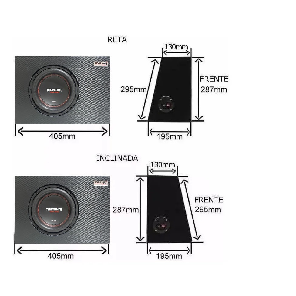 A Aleta Online tem o prazer de oferecer mais um produto de excelente qualidade, com um otimo precos para voce. Nossos produtos sao enviados em 24hrs e excelentemente embalados para sua seguranca. Estamos a disposicao para qualquer duvida sobre o produto. Somos uma empresa honesta e estamos prontos para resolver qualquer problema que possa ocorrer com a sua compra. A Caixa Acustica Tormento conta com um potente alto-falante 200w RMS de 8 polegadas de excelente resposta de frequencia proporcionando graves mais encorpados, somando qualidade ao som do seu carro. Descricao e Especificacoes Tecnicas . Linha Automotiva - Subwoofer . Caixa Acustica Subwoofer Tormento 8 . Potencia Maxima: 200 Watts RMS . Impedancia: 4 Ohms . Resistencia: 2,8 Ohms . Material: Gabinete em MDF 15mm (frente dupla) . Duto: 2" . Revestimento: Adesivo em Fibra de Carbono . Opcoes: Normal ou Invertida Dimensoes: 285mm x 405mm x 130mm topo x 205mm base (A x L x T x B) IMPORTANTE!!! -Se possivel em caso de compra de mais de uma unidade, realizar compras unitarias para evitar que os produtos tenham possiveis danos durante o transporte. -Verifique a compatibilidade do produto com seus equipamentos. -A instalacao deve ser feita por um profissional capacitado, nao nos responsabilizamos por uso indevido ou instalacao incorreta. A POSTAGEM SERA FEITA DENTRO DO PRAZO 24 HORAS UTEIS. GARANTIA 6 meses contra defeito de fabricacao A DEVOLUCAO/TROCA POR DEFEITO DE FABRICACAO NAO SERAO ACEITAS DEVOLUCOES DE PRODUTOS AVARIADOS, QUEIMADOS, RISCADOS, AMASSADOS, POR INSTALACAO, MANUSEIO, USO OU TRANSPORTE INCORRETOS, FORA DA EMBALAGEM ORIGINAL OU COM A MESMA DANIFICADA.