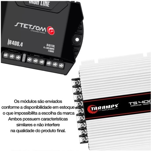 Itens Incluso: 01- Driver Corneta 100w RMS 01- Super Tweeter 100w RMS 01- Caixa de Som Trio 12 01- Subwoofer 12 Pioneer TS-w3060br 350w RMS 01- Modulo Taramps TL1500 ou Stetsom conforme anuncio* 01- Cabo RCA 5 metros *Atenção: Não acompanha fiação, o tamanho do fio varia de acordo do modelo do carro, a instalação deve ser feita por um profissional que colocara o fio na caixa. MÓDULO Potência RMS em 2 Ohm 13,8V 2 x 90W RMS + 1 x 200W RMS - mono em 4 ohms Potência RMS em 4 Ohm 13,8V 2 x 55W RMS + 1 x 200W RMS - mono em 4 ohms Resposta em Frequência 90Hz ~ 24KHz- Stereo / 10 Hz ~ 90Hz- Mono Crossover Low Pass 90 Hz Crossover High Pass 90 Hz Impedância Mínima de Saída 2 Ohms - Stereo Impedância Mínima de Saída 4 Ohms - Mono Consumo com Sinal Musical 16 A Consumo com Sinal Bass 32 A SUBWOOFER 12 PIONEER TS-W3060BR - 350W RMS Potência máxima - 600 W Potência de entrada nominal RMS - 350 W Resposta em frequência - 30 Hz a 2.000 Hz Sensibilidade - 87 dB (1 W / 1 m) Frequência de ressonância - 46 Hz Impedância - 4 ohms Profundidade de instalação - 146 mm Dimensões do alto-falante - Ø306 mm x 157 mm Dimensões para corte - Ø277 mm Qts 0,96, Fs 46 Hz, Vas 38,1 litros, Xmax 6 mm DRIVER CORNETA 100W RMS Potência RMS: 100W Potência Musical: 500W PMPO Impedância: 8O (Ohms) Resposta de frenquencia: 400 a 9000 Hz Frequência de corte: 1000Hz ( com uso de corte de frequência a 12 dB/w/m) Diafragma fenólico SUPER TWEETER 100W RMS O tweeter é ideal para ambientes como salões, auditórios e teatros. Possui uma elevada eficiência e baixa distorção na reprodução. Diafragma fenólico Corpo de bobina Kapton Potência RMS: 100W Potência Musical: 500W Impedância: 8 (Ohms) Resposta de Frequência: 3500 a 20000 Hz Frequência de corte: 8000Hz (a 12 dB/w/m) SPL: 108 dB/w/m CAIXA TRIO 12 DUTADA Revestimento em Carpete Cinza e Frente Corvin Preto Dimensões: Altura 33cm x Largura 60cm Profundidade Superior: 23cm x Inferior: 36cm Inclinação: 34cm Duto 3 polegadas *Atenção: Não acompanha fiação, o tamanho do fio varia de acordo do modelo do carro, a instalação deve ser feita por um profissional que colocara o fio na caixa.