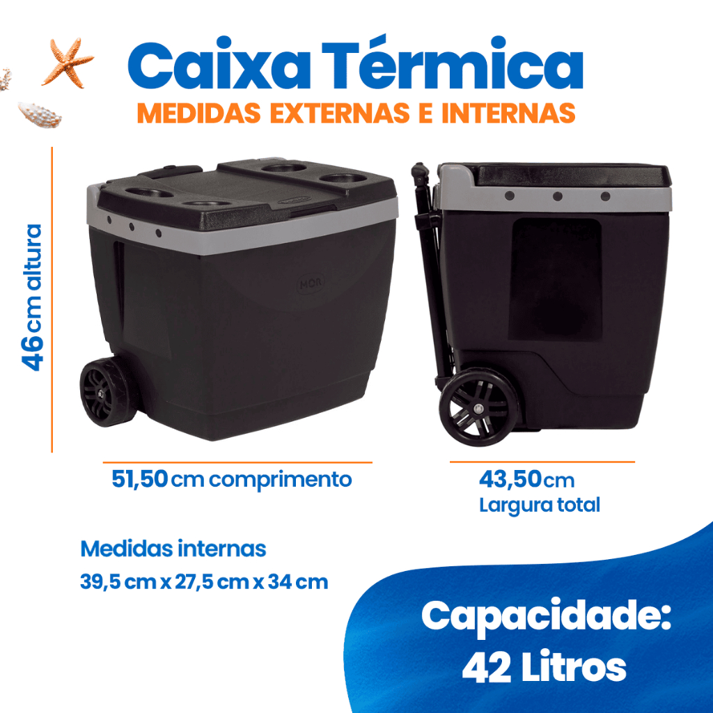 🧳 Praticidade e Mobilidade Projetada para aguentar movimentações e variações de temperatura, essa caixa térmica possui: Alça retrátil com três níveis de ajuste 🔝 Rodas largas de rolagem suave, ideais para qualquer terreno 🛞💨 Tampa articulada, sempre presa à caixa para evitar contato com o chão Apoio superior para 4 copos, latas ou garrafas 🍺🍹 📦 Capacidade Surpreendente Seu amplo espaço interno comporta: 56 latinhas de 350 ml em pé 44 latas de 473 ml (em pé ou deitadas) 29 garrafas de 600 ml deitadas 8 garrafas de 2 litros deitadas ou em pé (Capacidades calculadas sem gelo) 🎨 Cores Disponíveis 🔵 Azul 🔴 Vermelha ⚫ Preta A Caixa Térmica MOR 42L garante praticidade, resistência e mantém suas bebidas e alimentos gelados por muito mais tempo — perfeita para seus momentos de lazer! 🌞 📐 MEDIDAS Comprimento: 51,5 cm Altura: 46 cm Largura: 43,5 cm 🧴 MATERIAL Polipropileno 🧊 ITENS INCLUSOS 01 Caixa Térmica com Rodinhas 42L 🛡️ GARANTIA 90 dias contra defeitos de fabricação.