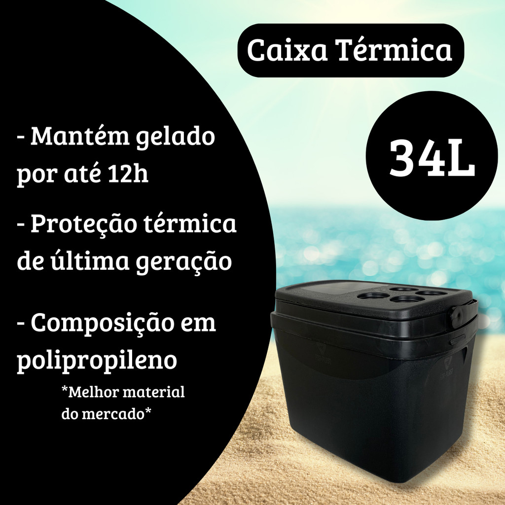 Caixa Térmica Cooler Preta Para Bebidas Carnes Drinks Gelo 34 Litros Com Alça Porta Copo