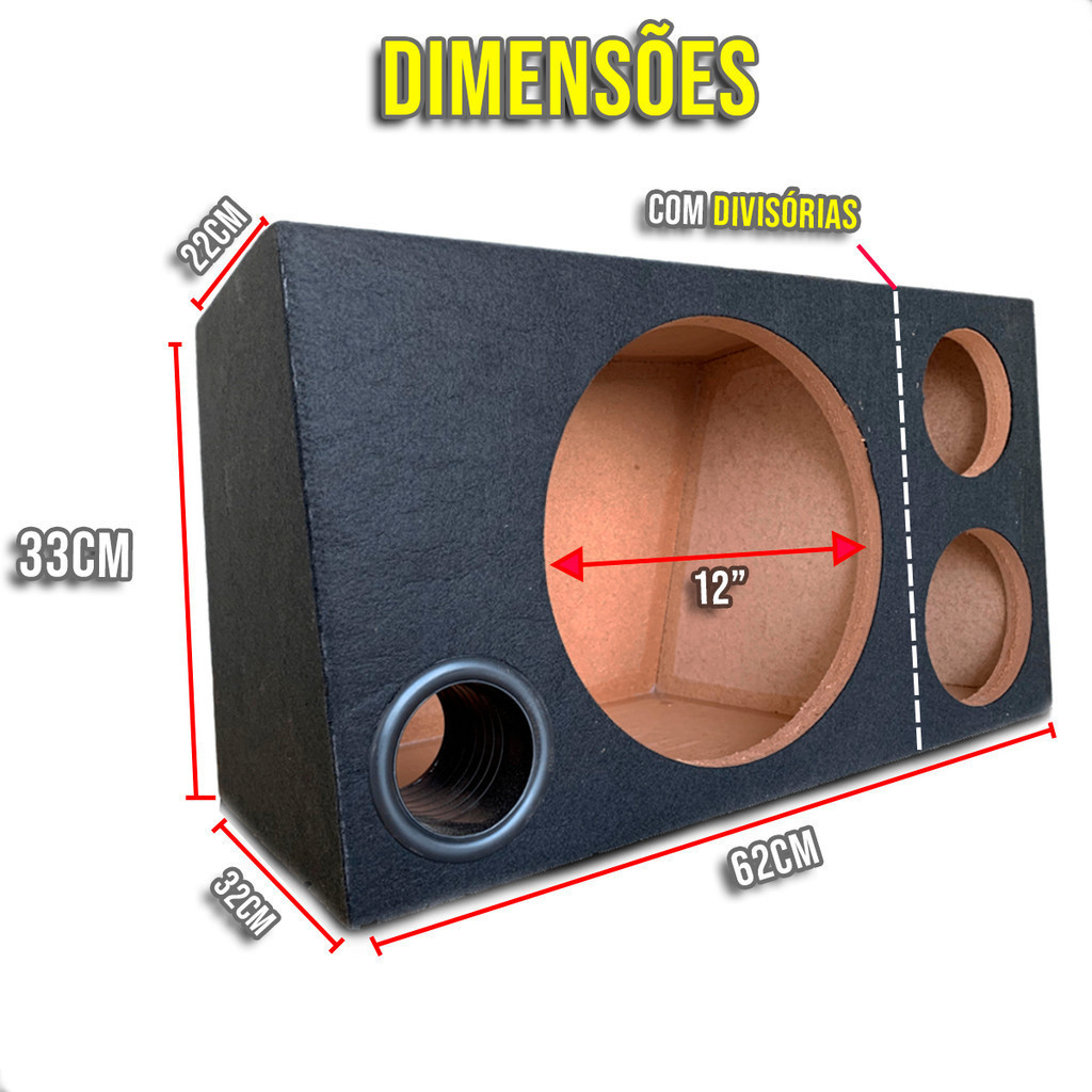 Caixa De Som Automotivo Vazia Trio Dutada Duto Redondo Selada 38 Litros Falante Boca 12" Polegadas Com Divisória 100% MDF 15mm Gravão Drive Tweeter Corneta Subwoofers ESPECIFICAÇÕES TÉCNICAS: - Caixa VAZIA em madeira MDF Madeira do futuro) 15mm - Colada e Pinada - Para 1 alto falante de 12 + 1 drive e 1 Tweeter - Litragem: 38 litros totais ideal sendo 32 Litros o SUB - Revestimento: Corino e Carpete forração - ACOMPANHA DUTO ( 3" Polegadas ) - MEDIDAS EXTERNAS: Altura: 33cm/ Largura: 32cm Profundidade Inferior (base)/ Profundidade superior(teto): 22cm Caixa ideal para o seu projeto de som automotivo. PRODUTO ACIMA NÃO ACOMPANHA ALTO FALANTES, DRIVER E SUPER TWEETER !!! Conteúdo da embalagem: 01 Caixa trio vazia de 12 polegadas frente Mdf.