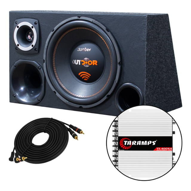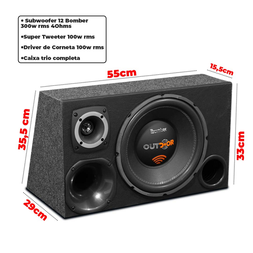 Itens Inclusos: 1 - Subwoofer 12 Bomber 300w rms 4Ohms 1 - Super Tweeter 100w rms 1 - Driver de Corneta 100w rms 1 - Caixa Trio dupla 1 - Modulo Amplificador Taramps TS400 1 - Cabo RCA 5 Metros Com essa caixa você poderá ouvir todos os tipos de som com uma alta qualidade aliada a uma enorme potência sonora, através deste sistema você poderá reproduzir sons em todas as faixas de áudio. Reproduzindo entre 40Hz e 25000Hz, conseguindo assim uma qualidade incomparável.