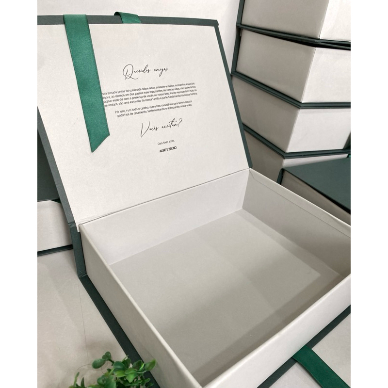 SUPER PROMOÇÃO POR TEMPO LIMITADO !!!! 📦 Descrição Completa: 💍 Caixa Cartonada para Padrinhos de Casamento – Sofisticação que Encanta! Convide seus padrinhos e madrinhas de forma inesquecível com nossas caixas cartonadas. Elas são ideais para montar kits personalizados com taças, bebidas, doces, fotos e muito mais ! Disponíveis em diversas cores (consulte nosso catálogo), essas caixas têm acabamento elegante e são perfeitas para transformar o convite em um momento especial. 🎁 Características do Produto: • Caixa cartonada rígida • Impressão na tampa da caixa 1 cor • Mensagem impressa dentro da caixa pode ser personaliza • Fechamento com laço de fita de cetim (opções de cores) • Feitos artesanalmente • Opções de cores conforme o catálogo • Ideal para casamentos, aniversário, lembranças ou kits personalizados • Medida 15x20x7cm • Anúncio referente a 13 unidades - VALOR PROMOCINAL. • Prazo de produção é de 15 dias úteis APÓS a data da compra + prazo de entrega GRATIDÃO E QUE DEUS NOS ABENÇOE SEMPRE !