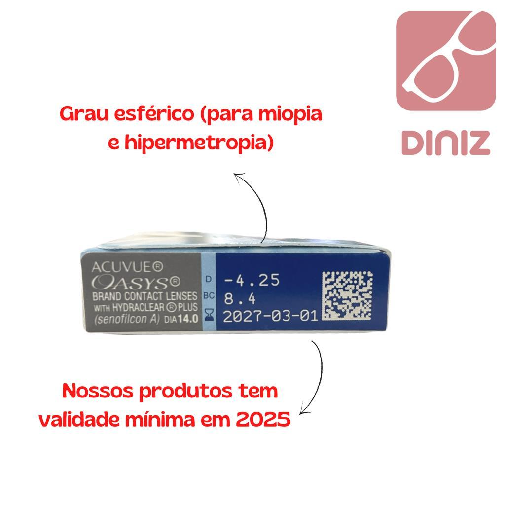 Seja bem-vindo às Óticas Diniz, aqui você encontra produtos originais, que acompanham nota fiscal e certificado de garantia da fábrica. -----> REDE ÓTICAS DINIZ, A MAIOR REDE DE ÓTICAS DO PAÍS -----> FAZEMOS ENTREGAS IMEDIATAS. -----> PRODUTOS NOVOS E ORIGINAIS, NUNCA DE MOSTRUÁRIO Todos os produtos passam por um setor de conferência antes de enviados para que chegue até o cliente sem avarias e conforme solicitado. Oferecemos aos nossos clientes a “Unboxing Experience”. Nosso encanto, todo nosso carinho especial sendo compartilhado com nossos clientes, no momento da abertura do seu produto em seus lares. Nunca foi sobre longe ou perto, mas como encurtar distâncias. Nem só pelo sol ou pelo som. Nunca foi sobre óculos e lentes. Foi sobre viver. Ver o melhor da vida. Diniz, a maior rede de óticas do Brasil. DESCRIÇÃO: Se você sente desconforto nos olhos depois de muitas horas de trabalho no computador, especialmente em ambientes com ar-condicionado ou aquecidos, as lentes de contato de troca programada ACUVUE OASYS® com HYDRACLEAR PLUS® são uma excelente opção para você. Fabricada a partir de um material único de silicone hidrogel, chamado senofilcon A, as lentes permitem um fornecimento superior de oxigênio quando comparadas a lentes de hidrogel comuns, para ajudar a manter os seus olhos mais confortáveis. ACUVUE OASYS® com HYDRACLEAR PLUS® oferece: • Superfície ultras suave que ajuda suas pálpebras a deslizarem facilmente sobre as lentes; • A maior proteção UV disponível em uma lente de troca programada; • Sensação similar à "estar sem lentes" (8 em cada 10 usuários "esquecem" que estão usando lentes); • Conforto superior ao ver televisão ou ao trabalhar no computador por longos períodos; • Conforto superior em ambientes secos, como espaços com ar-condicionado ou aquecidos; • Menor sensação de olhos secos e cansados durante o uso de lentes de contato; • Um excelente fornecimento de oxigênio para a córnea; • Lentes ultrafinas para uma visão confortável. ATENÇÃO! PARA GRAUS DIFERENTES SOLICITE O GRAU DA SEGUNDA CAIXA NO CHAT DO SEU PEDIDO! Cada caixa contêm 6 unidades do mesmo grau; DADOS TÉCNICOS: • Desenho: Esférico • Indicações: Correção de miopia e hipermetropia • Programa de Uso: (Uso Diário) Descarte quinzenal • Material: Senofilcon A (Silicone Hidrogel) • Hidratação: 38% • Cor de Visibilidade: SIM, (Aqua). Não muda a cor dos olhos, coloração apenas para fácil manuseio. • DK/t: 147 (Transmissão de oxigênio - DK/t) • Diâmetro (mm): 14,0 mm • Curva Base (mm): 8.4 mm • Espessura: 0,07 mm Dúvidas? Use o campo “Perguntas” temos uma equipe especializada para lhe auxiliar. ** Dica: o grau prescrito na receita médica de seus óculos pode não ser igual para as lentes de contato. Consulte com seu oftalmologista o grau correto para aquisição de suas lentes de contato, ou em caso de dúvidas, use o campo “Perguntas”. =) *ITENS INCLUSOS: Nota fiscal, 02 caixa de lente de contato Acuvue Oasys by Johnson + 01 estojo para lentes + 01 Solução 60 ml + 01 necessaire (modelo à depender da disponibilidade estoque). Imagens ilustrativas, podem não refletir 100% a realidade do produto. Agradecemos desde já por escolher as Óticas Diniz.