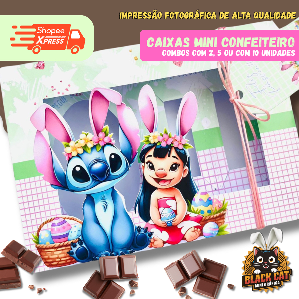 CAIXAS MINI CONFEITEIRO PÁSCOA 18X13X4CM CAIXA COM ACETATO E BERÇO PARA OVO 150G LILO E STITCH E ANGEL