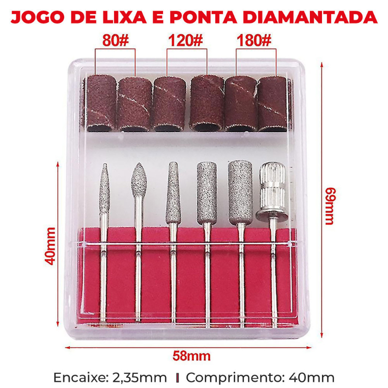 Caixinha com 6 Brocas Lixa Elétrica Lixadeiras Unhas Manicure + 6 Refis de Lixas