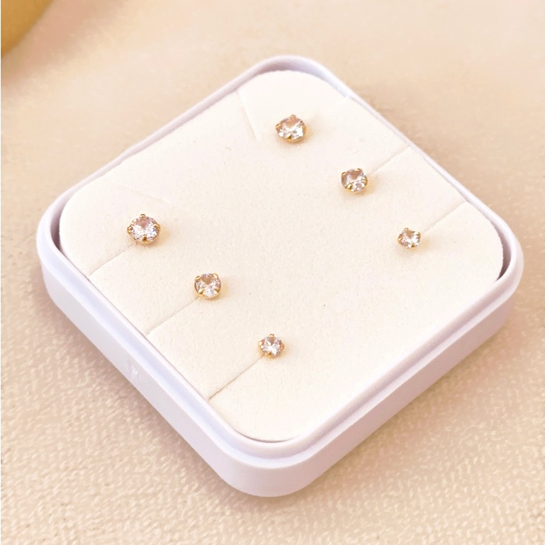 Caixinha com Trio de Brincos Infantis Zircônia P, M e G Folheado a Ouro 18K-Hipoalergênico com Tarraxa Baby de Segurança