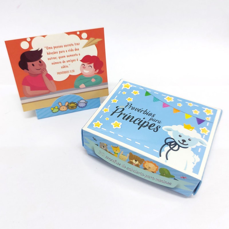 Caixinha de Versículos Diários Caixa com Provérbios para Príncipes, produzido pelo Ministério Ainda Há Esperança - Chile. Caixinha com 30 Conselhos de sabedoria para meninos, proporcionando um momento com Deus a cada dia. Lindo design, acabamento e acompanha um suporte para apoiar o cartão de pé, presente ideal para amigos e familiares. Título: Provérbios para meninos Subtítulo: 30 Conselhos de sabedoria para meninos Quantidade: 30 cartões Dimensões: Altura: 6,5 cm Largura: 8,5 cm Profundidade: 2,5 cm Editora: Manancial