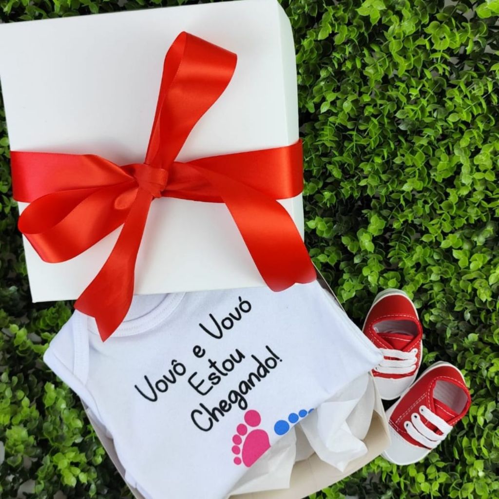 Caixinha Revelação de Gravidez Surpresa com Body Manga Curta e Sapatinho Anúncio Grávida