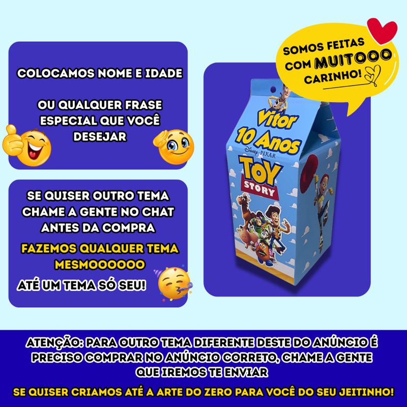 O produto se trata de um produto PERSONALIZADO, produzido a partir da compra, OU SEJA, pelo CDC (Código de Defesa do Consumidor) não tem reembolso nem devolução, exceto em caso de erro do vendedor, então ATENÇÃO as informações ANTES DA COMPRA para deixar sua festa ainda mais especial e sem imprevistos!! 💕 ATENÇÃO AS INFORMAÇÕES:** ⚠ As caixinhas NÃO ACOMPANHAM fita nem cola! ❌ NÃO enviamos a arte para aprovação. Este anúncio se refere ao tema, formato de caixinha e arte da foto do anúncio!! Alteramos SOMENTE nome e idade conforme solicitado!! ❌ NÃO REALIZAMOS ALTERAÇÕES NA ARTE, TEMA E FORMATO COMPRADO - **EXEMPLO: se vc comprou o formato MILK de um determinado TEMA, será enviado conforme o pedido, a personalização é somente de NOME e IDADE. 👀⚠ CASO você queira uma ARTE EXCLUSIVA ou um outro TEMA ou FORMATO a compra deve ser realizada no anúncio ESCOLHA O TEMA aqui na nossa loja na shopee!!! APENAS no anúncio ESCOLHA O TEMA (que está na nossa loja aqui na shopee) um designer designado EXCLUSIVAMENTE PARA VOCÊ cria uma arte do ZERO e envia para sua aprovação, nas cores e preferências que você quiser! ❌ AS CAIXINHAS NÃO VÃO MONTADAS, elas são personalizadas e enviadas já CORTADAS E VINCADAS ✅, a montagem é fácil e acompanha um QR CODE com o vídeo tutorial de montagem. ⚠ As caixinhas PRECISAM de cola para unir as laterais (NÃO ACOMPANHA)!! ⚠Entrega rápida: Produto é enviado de 12h a 24h em dias úteis (OU SEJA, caso não sejam enviadas as informações de IDADE e NOME logo após a compra no CHAT ou nas INFORMAÇÕES DO PEDIDO será enviado SEM PERSONALIZAÇÃO). ⚠ Medidas da caixinha: - Caixinha Milk: 14cm de altura x6 cm de largura (cada lado) - ESPAÇO ÚTIL: 9cm de altura x 6cm de largura (cada lado) 🟢 Nas imagens do anúncio, há uma ilustração com as medidas para uma melhor conferência. Verifique-as com atenção antes de finalizar a compra! Lembre-se de conferir as medidas antes de finalizar a compra para garantir o melhor aproveitamento! 🌟 Características do Produto/MATERIAL: 🟢 Papel de alta qualidade (impressão com CORES VIVAS): Disponível no papel fotográfico GRAMATURA 180g brilhante. (SELECIONE A QUANTIDADE ESCOLHIDA NO ATO DA COMPRA AO ADICIONAR NO CARRINHO) ❌As caixinhas não são de papelão!! São de papel 180g, caixinhas simples, práticas para deixar sua festa mais linda com o melhor custo-benefício!! ✅ Ideal para: Festas de aniversário, chá de bebê, casamentos, eventos corporativos e muito mais! Caso não seja enviado o nome e a idade NO ATO DA COMPRA quando chegar o PRAZO DE POSTAGEM DA SHOPEE será produzido e postado SEM PERSONALIZAÇÃO!! Garanta já a sua caixinha personalizada e faça seus momentos ainda mais especiais! ✨